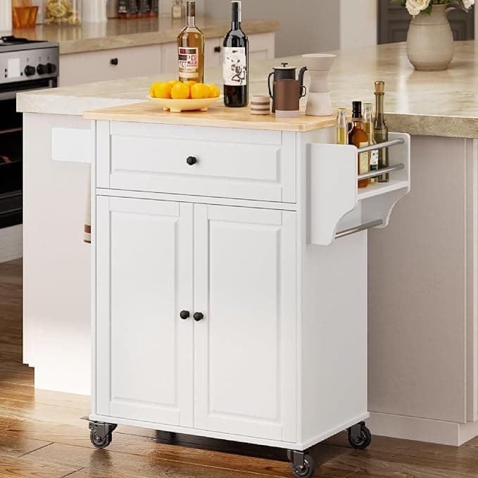 Bealife Carrello da Cucina con Ruote e Piano di Lavoro - Carrello di Servizio con 2 Ante e 1 Cassetto, Credenza Salvaspazio per Cucina (Bianco)
