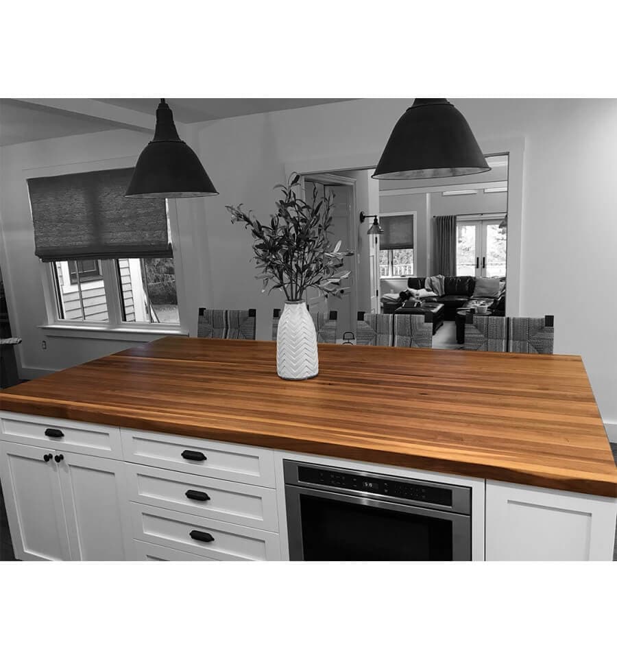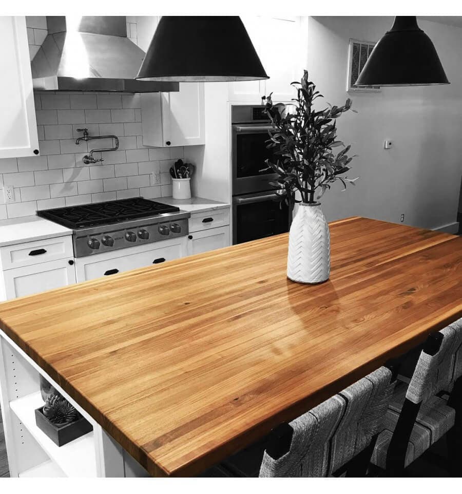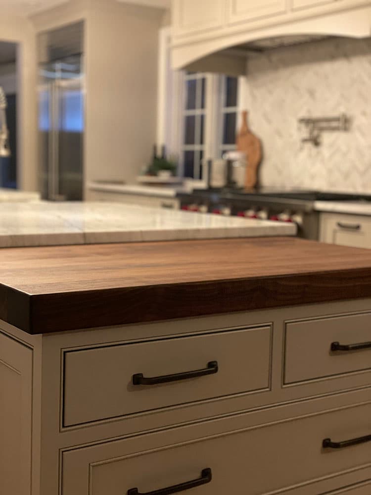This fully customizable Walnut Butcher Block Counter Top will surely be the focal point of your kitchen. Made with gorgeous high-quality black walnut, hand-picked and sustainably sourced from domestic locations, this counter top features the full spectrum of the walnut tree; the older dark browns of the heartwood and younger lighter tones of the heartwood. Our walnut counter tops are both beautiful and durable and are made to last. The butcher block displayed here is 1.75″ standard thickness. All counter tops are customizable to your desired size, edging, thickness, and finish. Sink cut-outs are also possible, as well as cut outs for other appliances.