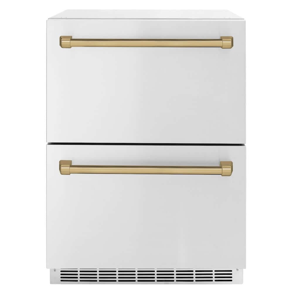 The ZLINE Autograph Edition 24 in. Touchstone 168 Can Outdoor-Rated Dual Refrigerator Drawer with Stainless Steel Doors and Champagne Bronze Handles (RDSOZ-ST-24-CB) features state-of-the-art cooling technology, dual smooth glide soft-closing drawers, and an expansive interior capable of holding multiple beverages.