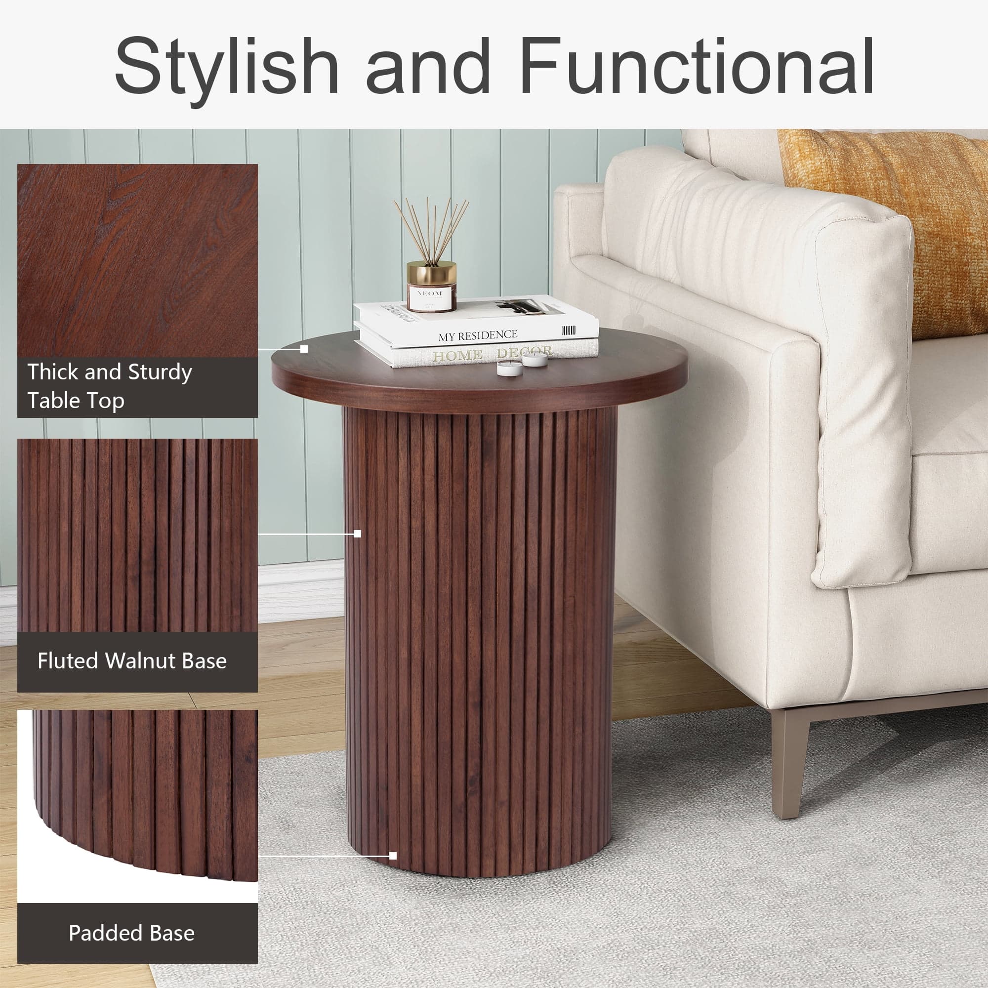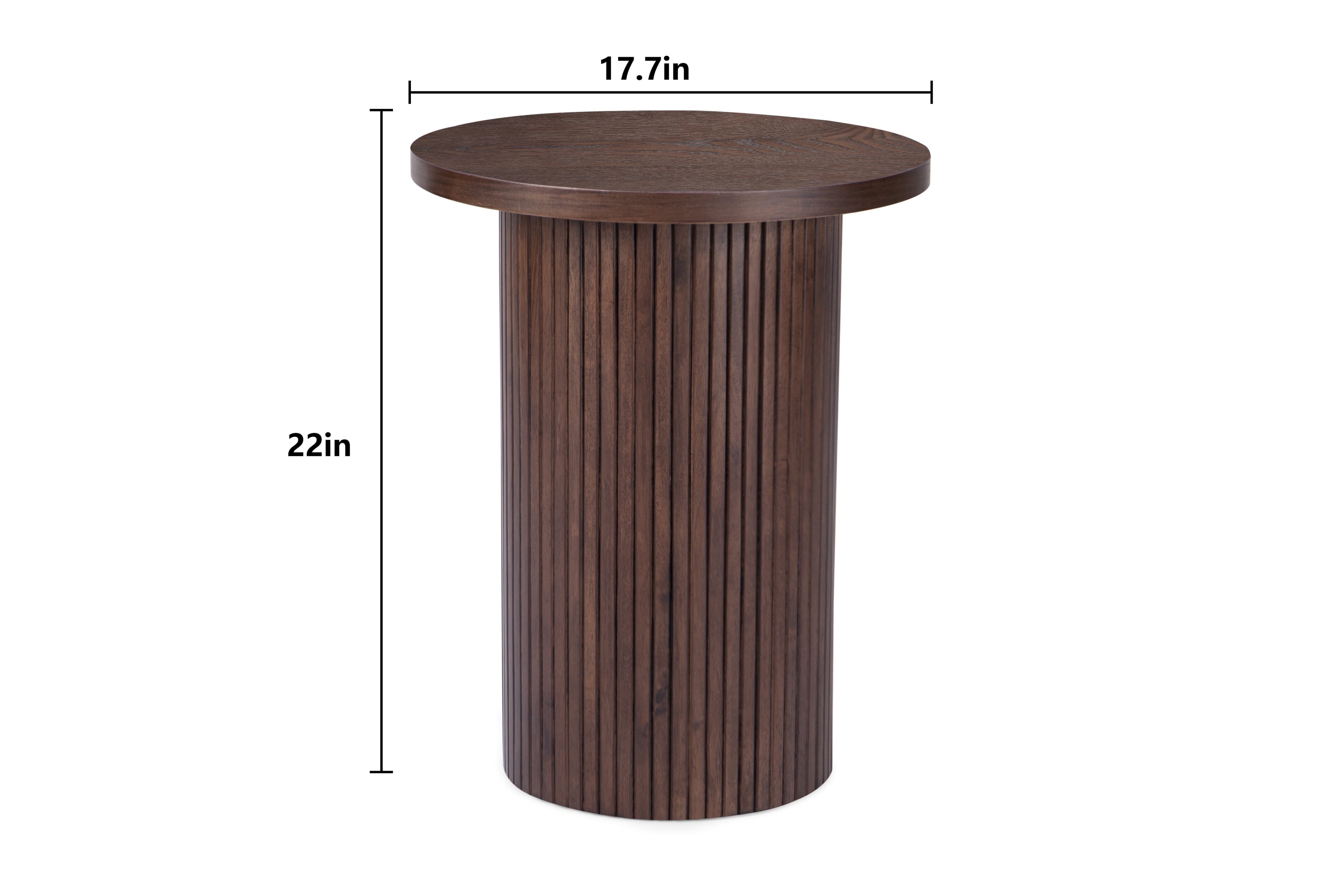 The round solid wood end table features a brown pedestal base and a 17.7" x 17.7" table top with a height of 22". Made from sturdy solid wood, it has a unique vintage brown finish and a linear pedestal-like texture. The table can be used as a plant stand, nightstand, or lamp stand, and its top can hold items like photo frames or vases. It is suitable for various occasions and spaces, including bedrooms and living rooms, and its solid wood construction provides a refined and eclectic look. The table's design makes it versatile and practical for everyday use.