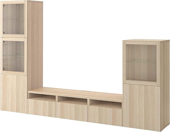 IKEA BESTÅ Combinaison de rangement TV avec portes en verre, 300 x 42 x 193 cm, effet chêne teinté blanc/chêne laqué blanc