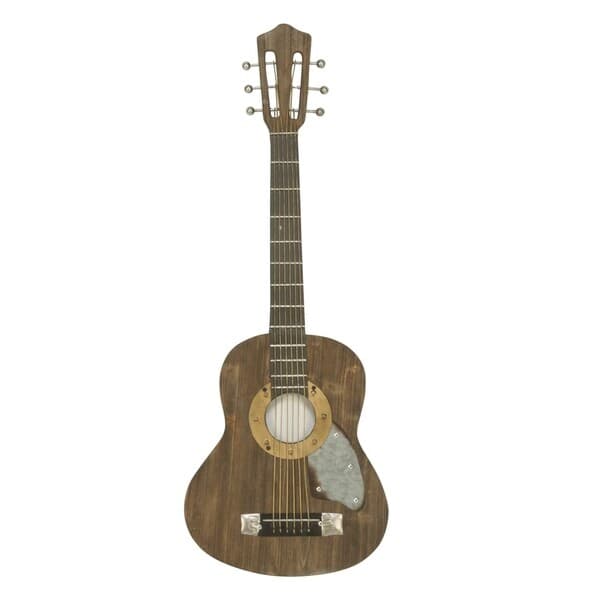Show your love for music and art with a Wall Hanging Acoustic Guitar. The guitar is made of wood with metal strings and accents creating a rustic and industrial look. The guitar is only half an inch thick offering a great decor piece for any sized room.