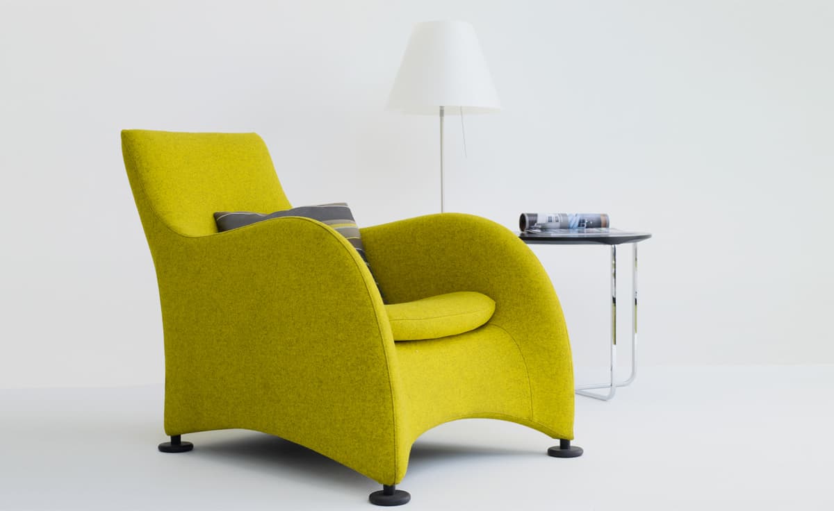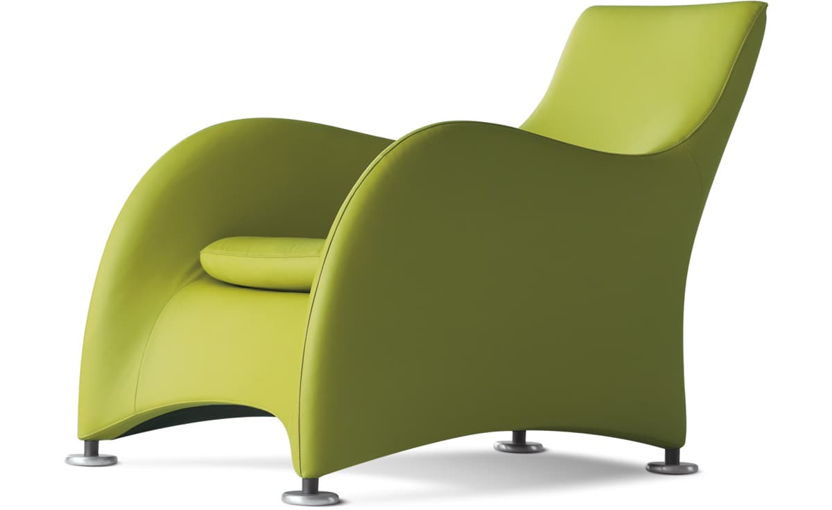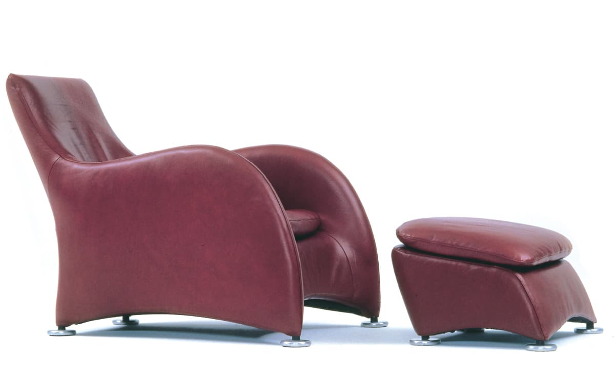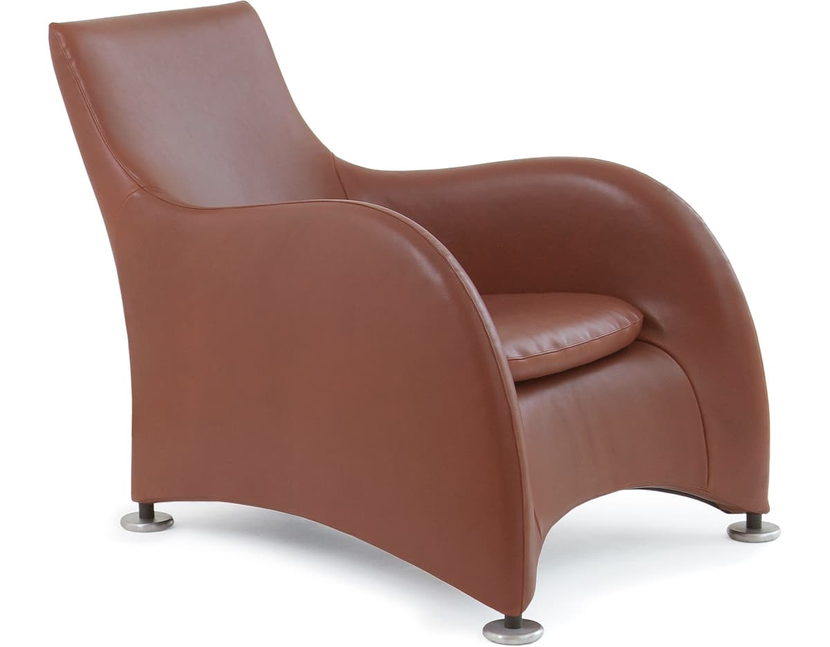 Design Gerard Van den Berg, 1989. Upholstery, aluminum feet. Made in Holland by Montis. This armchair caters to people who love to slide right down in a chair. Since the apparent shape is low and deep, but the seat is actually shallow on the inside, the Loge is also suitable for tall people. Its distinguished, streamlined shape gives the Loge an air of masculine sportsmanship, comparable with a classic racing car. Loge is also offered In combination with the ottoman producing the perfect chair to relax in. Loge is available in your choice of a variety of fabrics or leathers and features four metal discs as feet.