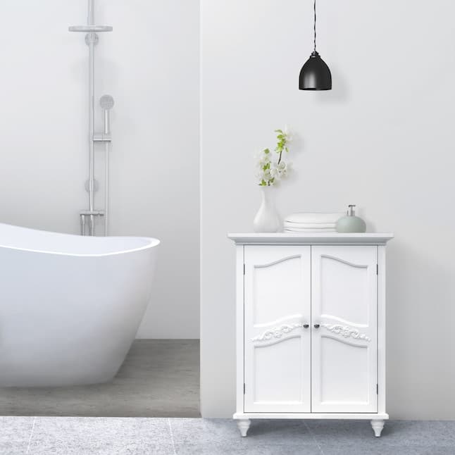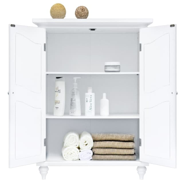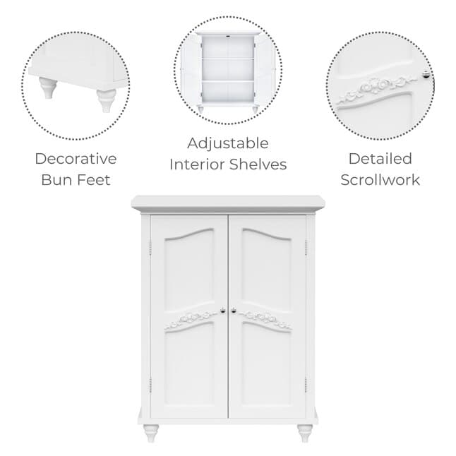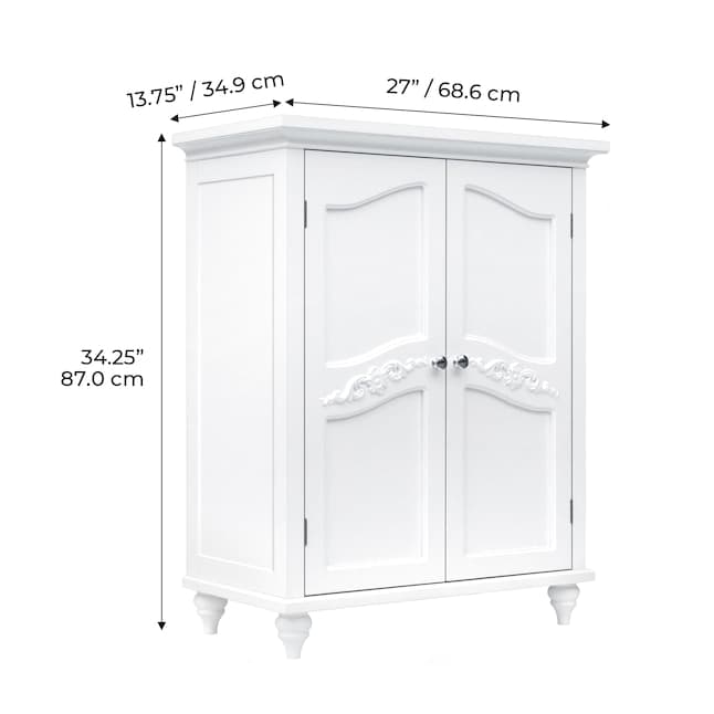 Upgrade your home storage while adding classic style with the Teamson Home Versailles Wooden Floor Cabinet with 2 Shelves. This decorative cabinet features a clean white finish with a crown molded top, metal knobs, and engraved doors for a timeless addition to your space. The 2 included adjustable shelves make this cabinet functional and customizable to suit your storage needs. Constructed from durable engineered wood, this storage unit is built to provide you with long-lasting organization.