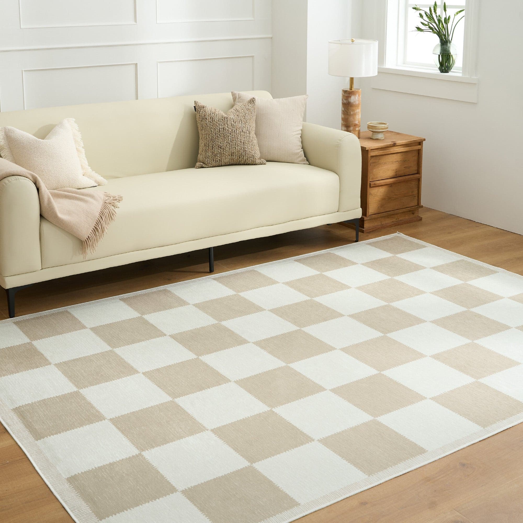 Slashop Easy Clean Washable Rug Timeless Beige Checkered Design Durable Spillproof Pet-Friendly Non-Slip Pad Living Room Area Rug