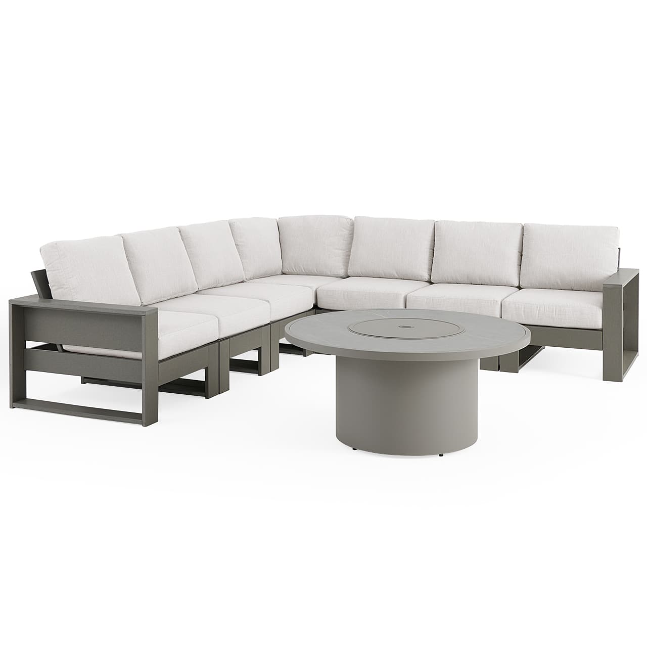 Montauk Slate Grey Polymer with Cushions 8 Piece Modular Sectional + 48 in. D Sintered Fire Pit Table (Cast Pumice)