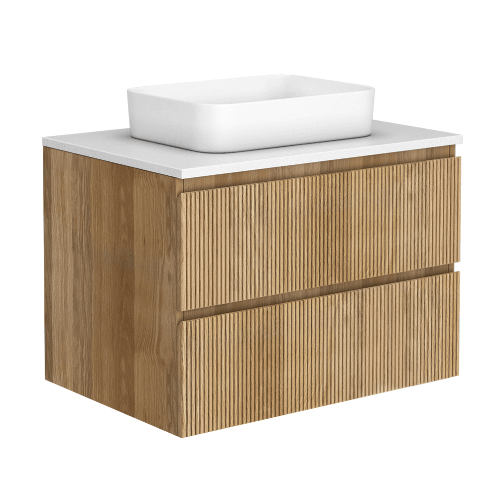 Osaka Slatted Oak 800mm Wall Hung 2-Drawer Countertop Vanity Unit with White Stone Worktop and Rectangular Basin