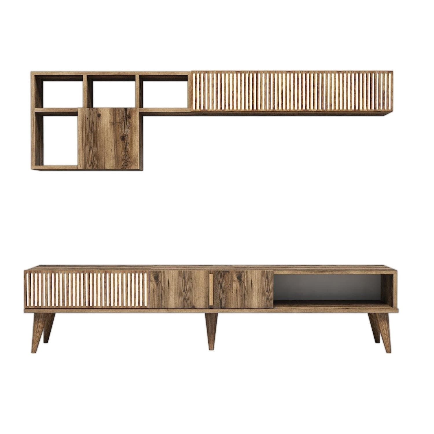 100% MELAMINE COATED PARTICLE BOARD Thickness: 18 mm TV Stand Size: 180 x 40 x 35 cm Wall Shelf Size: 180 x 48.6 x 20 cm Number of Packages: 3 181 x 36 x 6 cm (1 Piece) 101 x 41 x 8 cm (1 Piece) 26 x 21 x 16 cm (1 Piece)