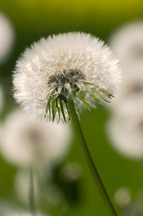 Dandelion (Taraxacum officinale) seed head. Each seed is topped by a feathery parachute (pappus) of fine hairs, which allows the seeds to be widely dispersed by the wind.