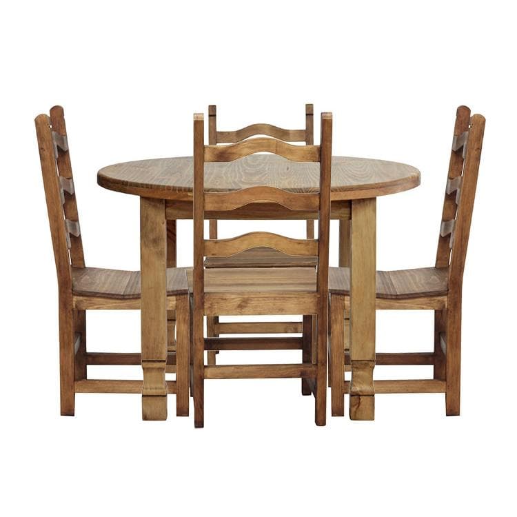Ideal for compact dining spaces or a covered patio, this Round Julio Dining Set is affordable and practical for al fresco meals. Its solid pine table features a rustic, distressed look with carved legs, ensuring long-lasting use. Paired with the Round Julio table, the Colonial Chair's curved ladder back and graceful design evoke a French country style. The pine construction and contoured seat offer durability and comfort. Made in Mexico, this set accommodates four adults comfortably.