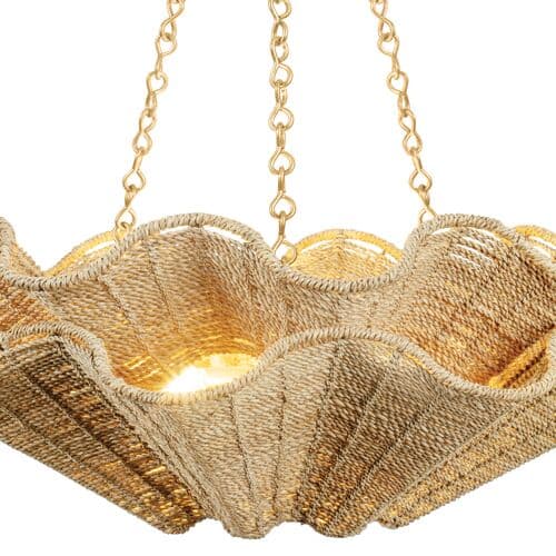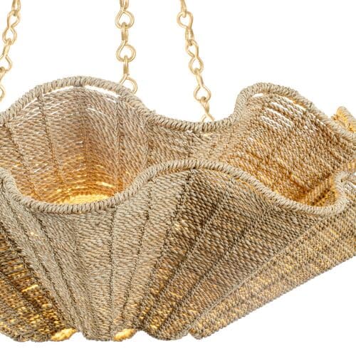Recalling the silhouette of a clamshell, this design puts an artisanal spin on coastal aesthetics. Two large shades woven from Abaca Rope embody lightness, while the chain provides a point of contrast, lending sleekness to the design. The opening at the bottom of the shade creates a concentrated beam that illuminates large areas. *Due to the one-of-a-kind nature of the medium, exact colors and patterns may vary slightly from the image shown.