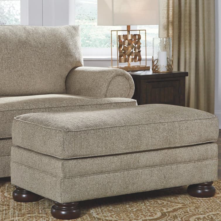 This sumptuously styled ottoman proves that a richly traditional look doesn’t have to break the bank. The choice of a plush chenille upholstery in oatmeal is earthy elegance at its best. Distinctively turned bun feet in a dark finish add to the ottoman’s substantial presence.