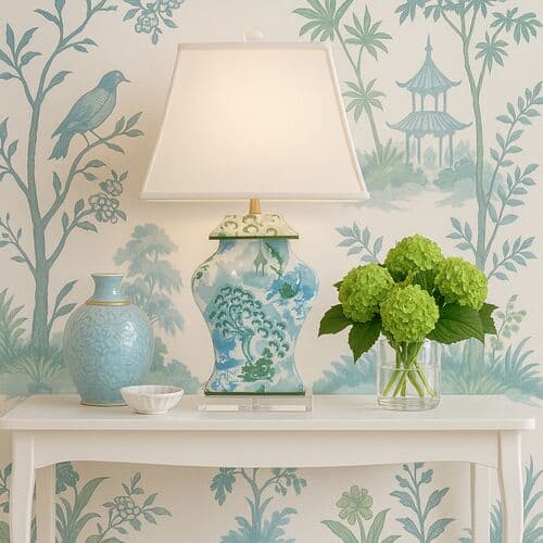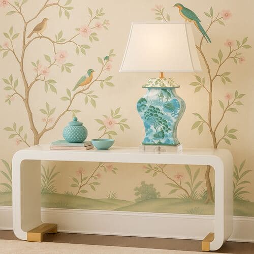 John Loecke, part of the dynamic Madcap Cottage duo, created the whimsical chinoiserie-influenced design on this porcelain table lamp. It rests on a clear acrylic base and is topped with a cotton-and-linen shade that emphasizes its shapely silhouette.