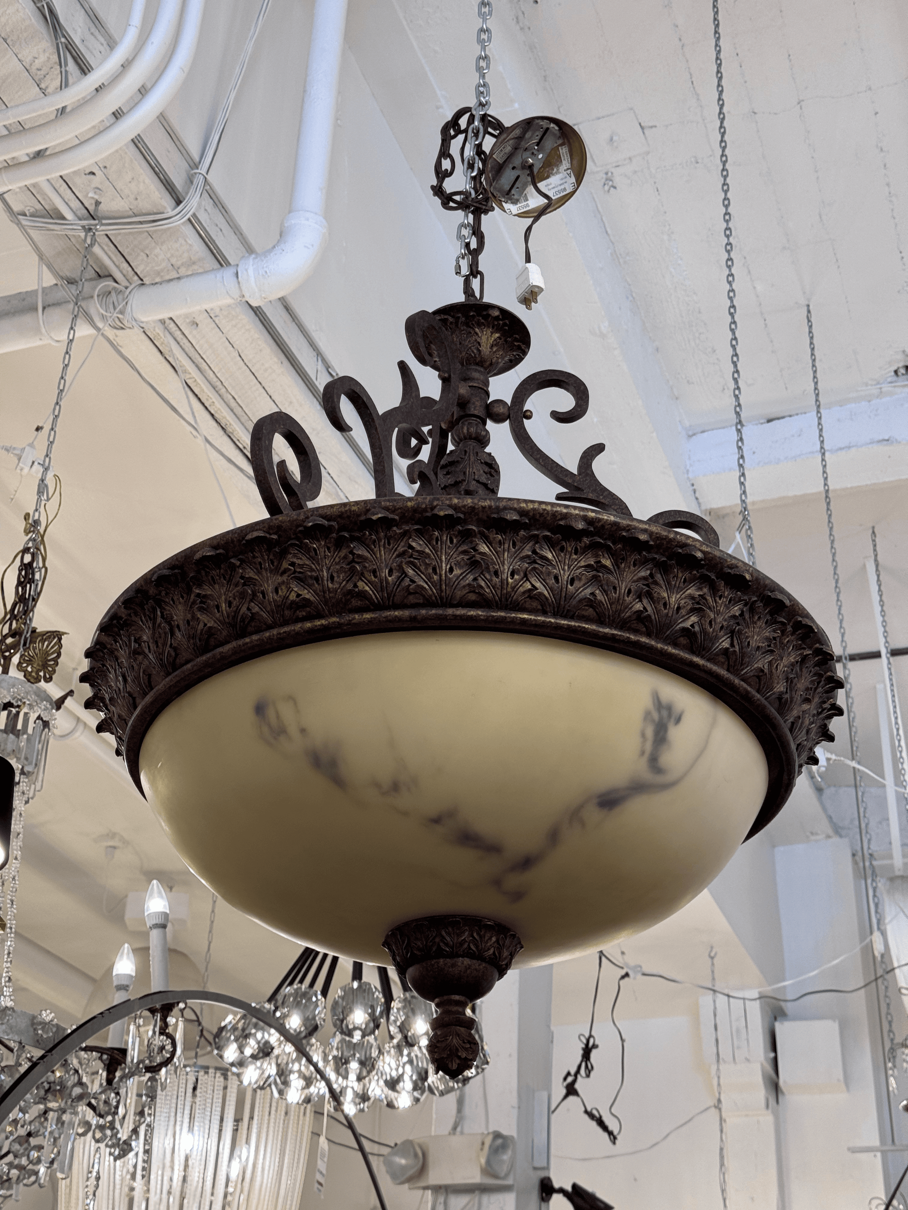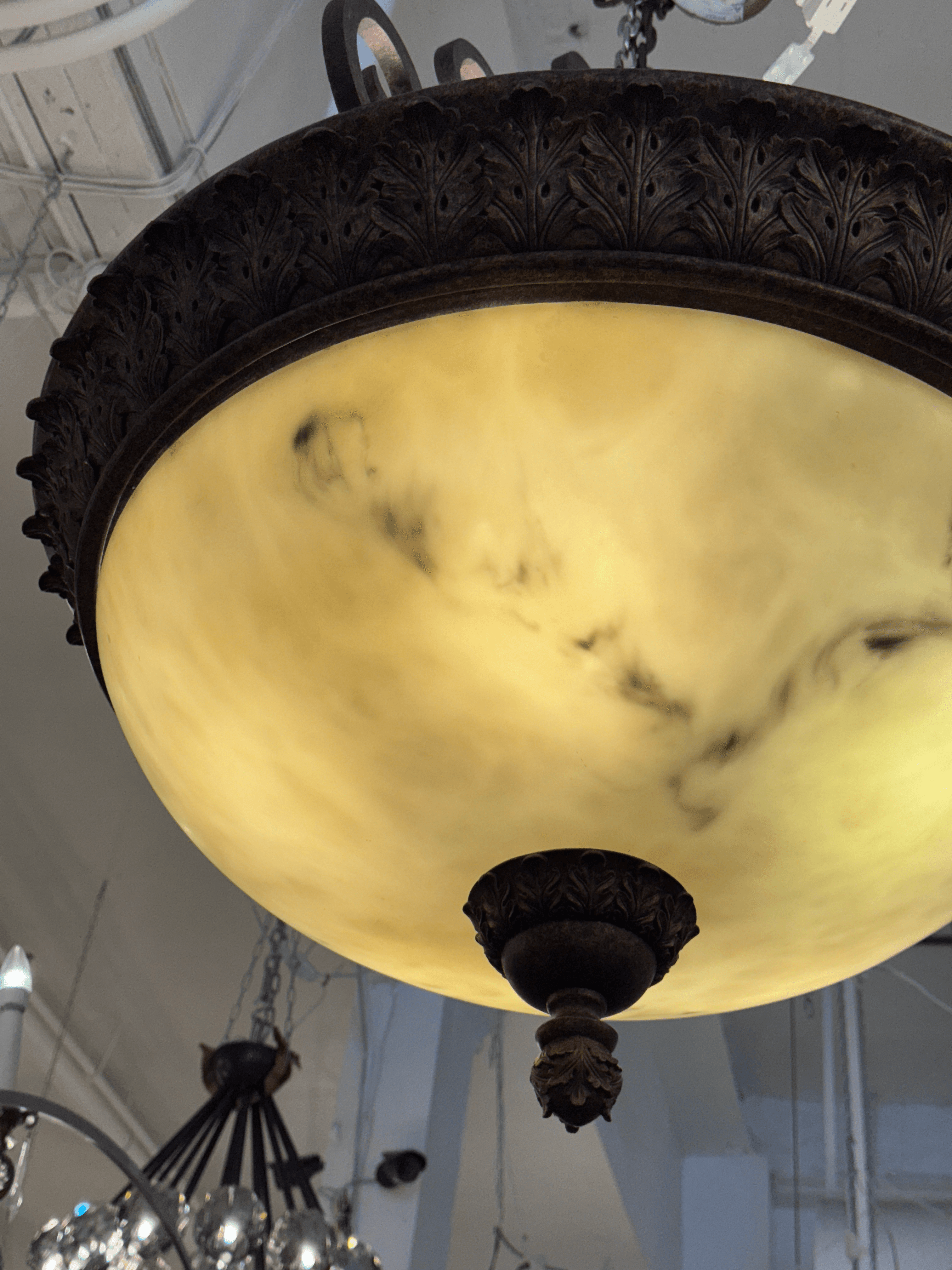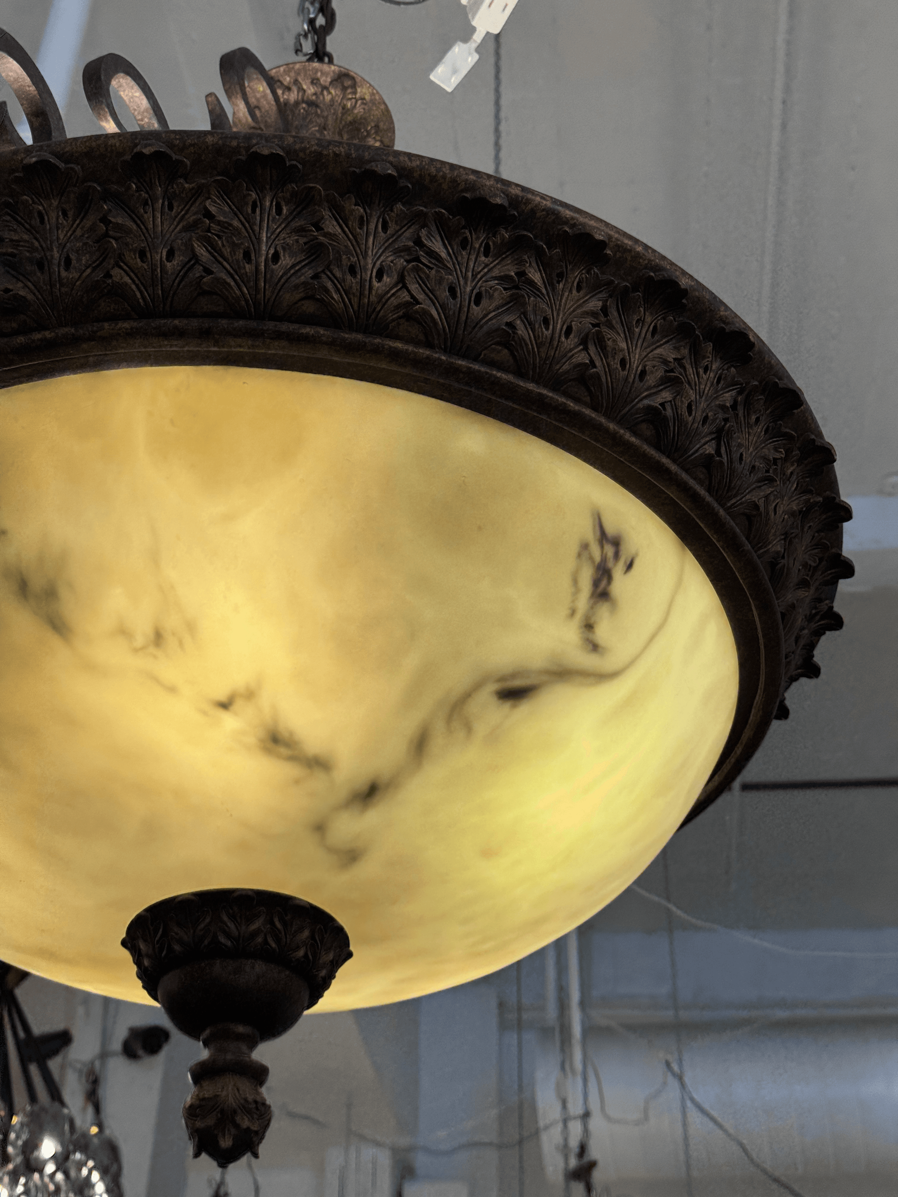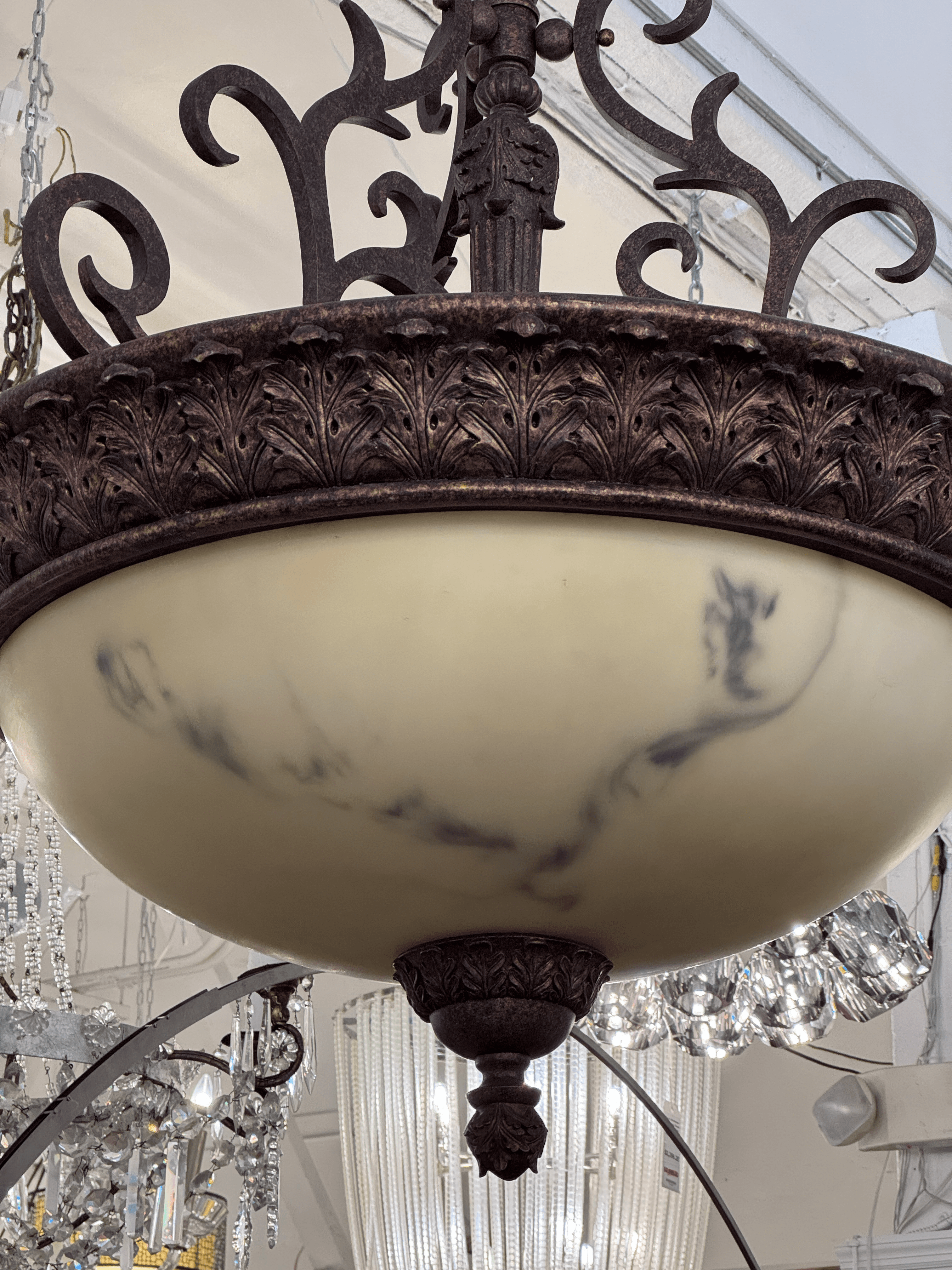 Design Plus Gallery presents an Art Deco Faux Alabaster Pendant Chandelier. This large vintage antiqued brass finish iron alabaster style dome pendant chandelier is full of old-world charm and elegance. The brass iron frame features detailing and a distressed finish, giving it a beautiful vintage look. The dome-shaped alabaster shade is sophisticated and diffuses the light in a warm and inviting manner. The chandelier is grand in size, making it a striking focal point. Its design and rich materials give it a luxurious and timeless appeal that is sure to enhance the ambience of a victorian space. Whether hung in a grand entryway, above a dining table, or in a formal living room, this chandelier is sure to make a statement and elevate the decor of the room. Is in good condition with an antique finish and patina that goes along with age.