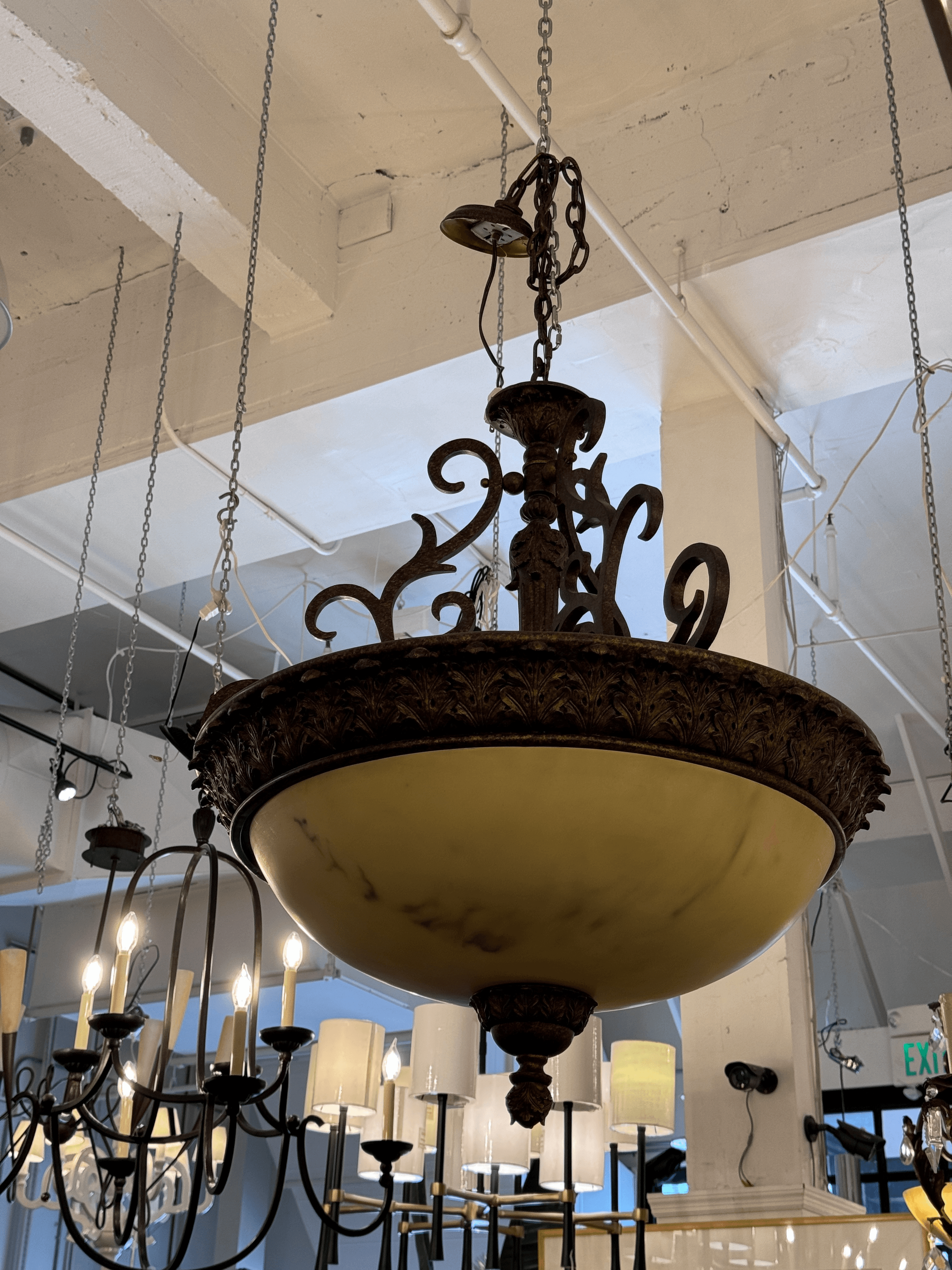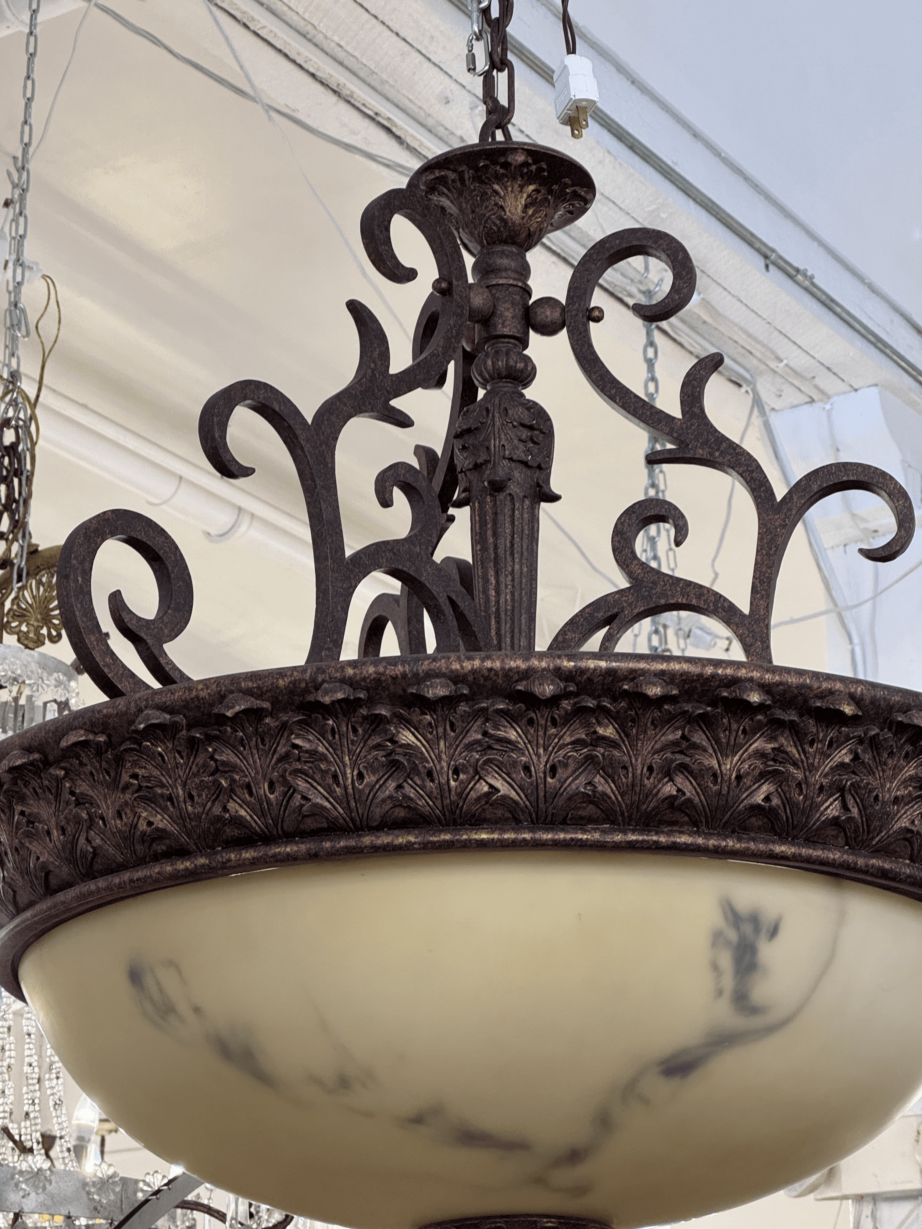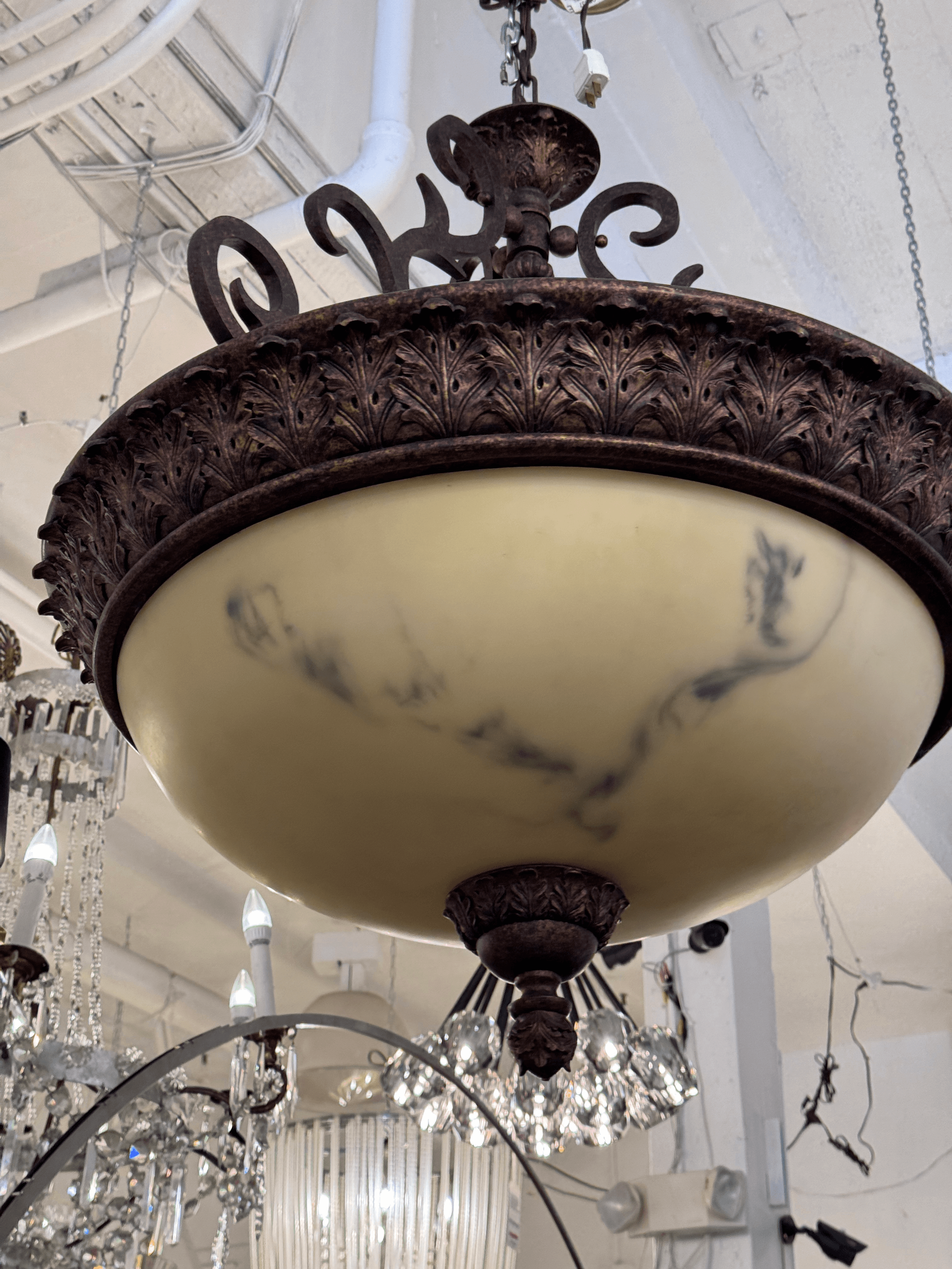 Design Plus Gallery presents an Art Deco Faux Alabaster Pendant Chandelier. This large vintage antiqued brass finish iron alabaster style dome pendant chandelier is full of old-world charm and elegance. The brass iron frame features detailing and a distressed finish, giving it a beautiful vintage look. The dome-shaped alabaster shade is sophisticated and diffuses the light in a warm and inviting manner. The chandelier is grand in size, making it a striking focal point. Its design and rich materials give it a luxurious and timeless appeal that is sure to enhance the ambience of a victorian space. Whether hung in a grand entryway, above a dining table, or in a formal living room, this chandelier is sure to make a statement and elevate the decor of the room. Is in good condition with an antique finish and patina that goes along with age.