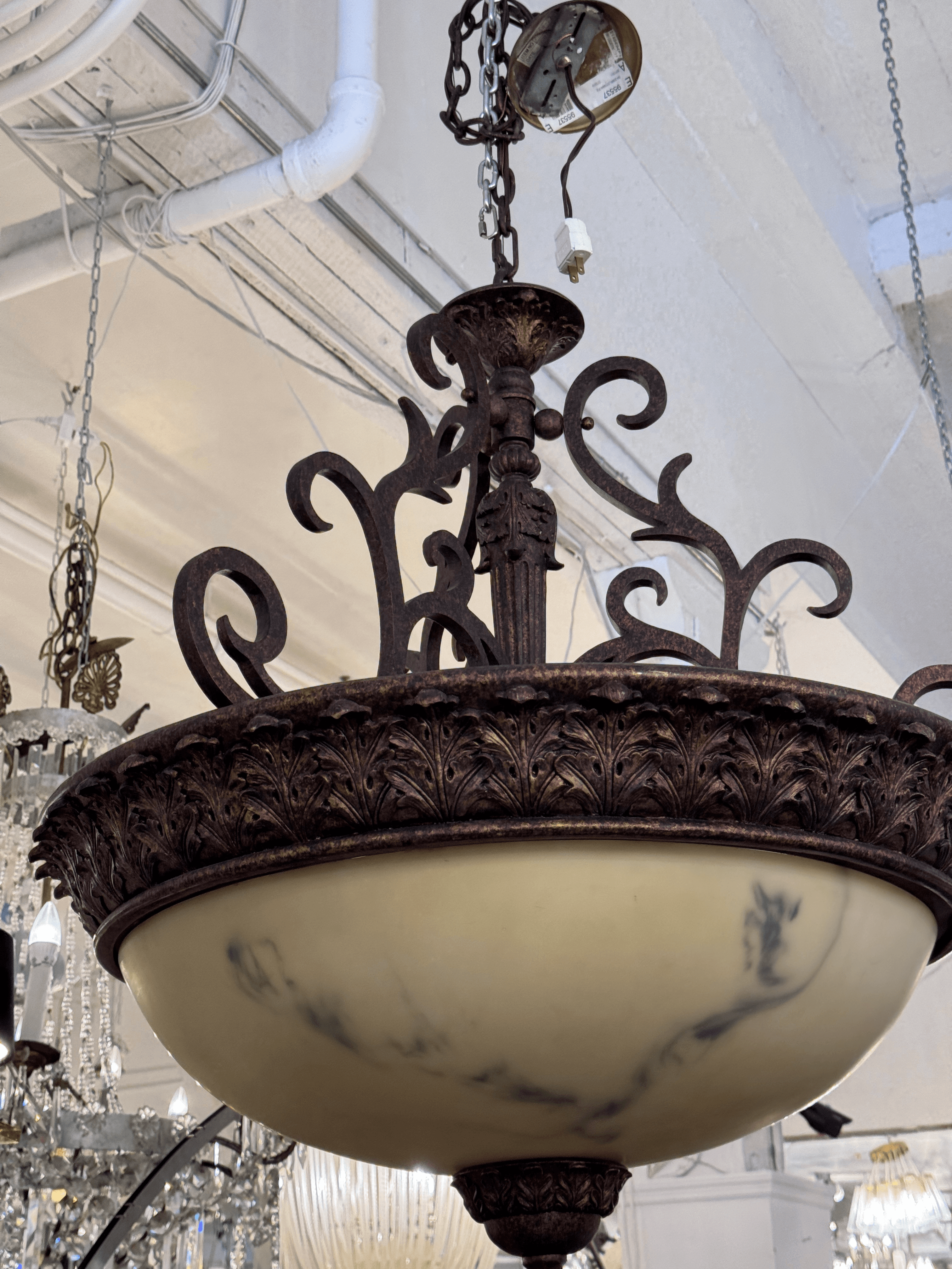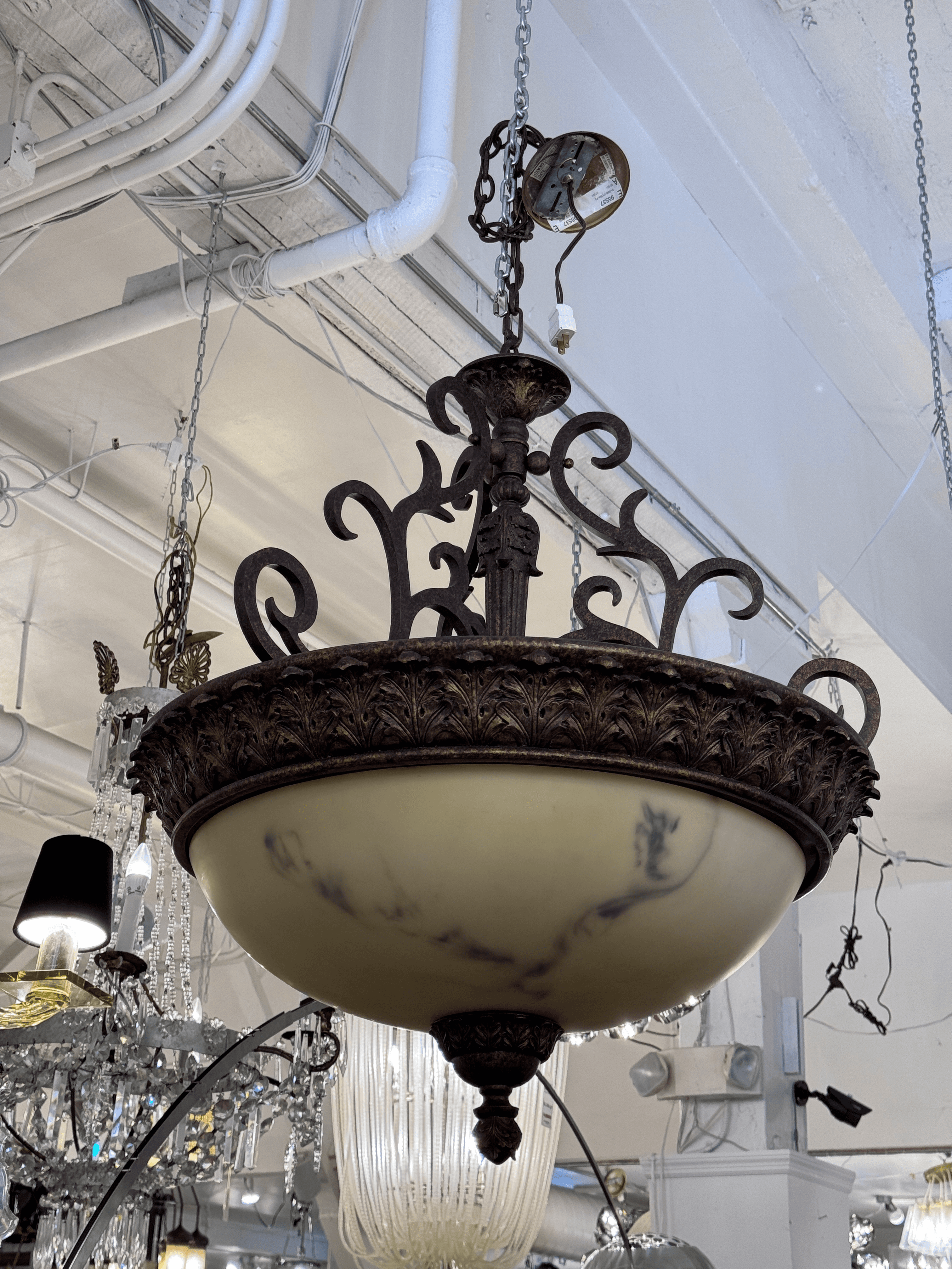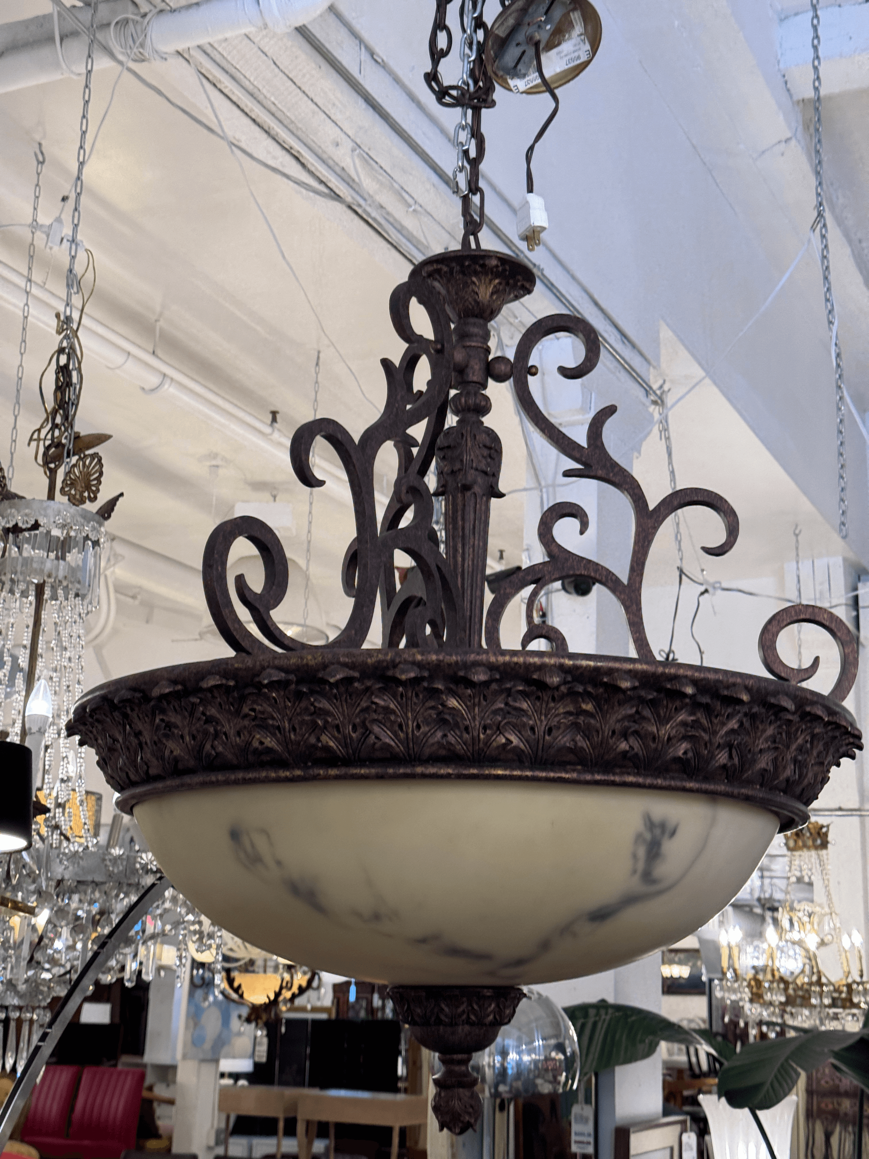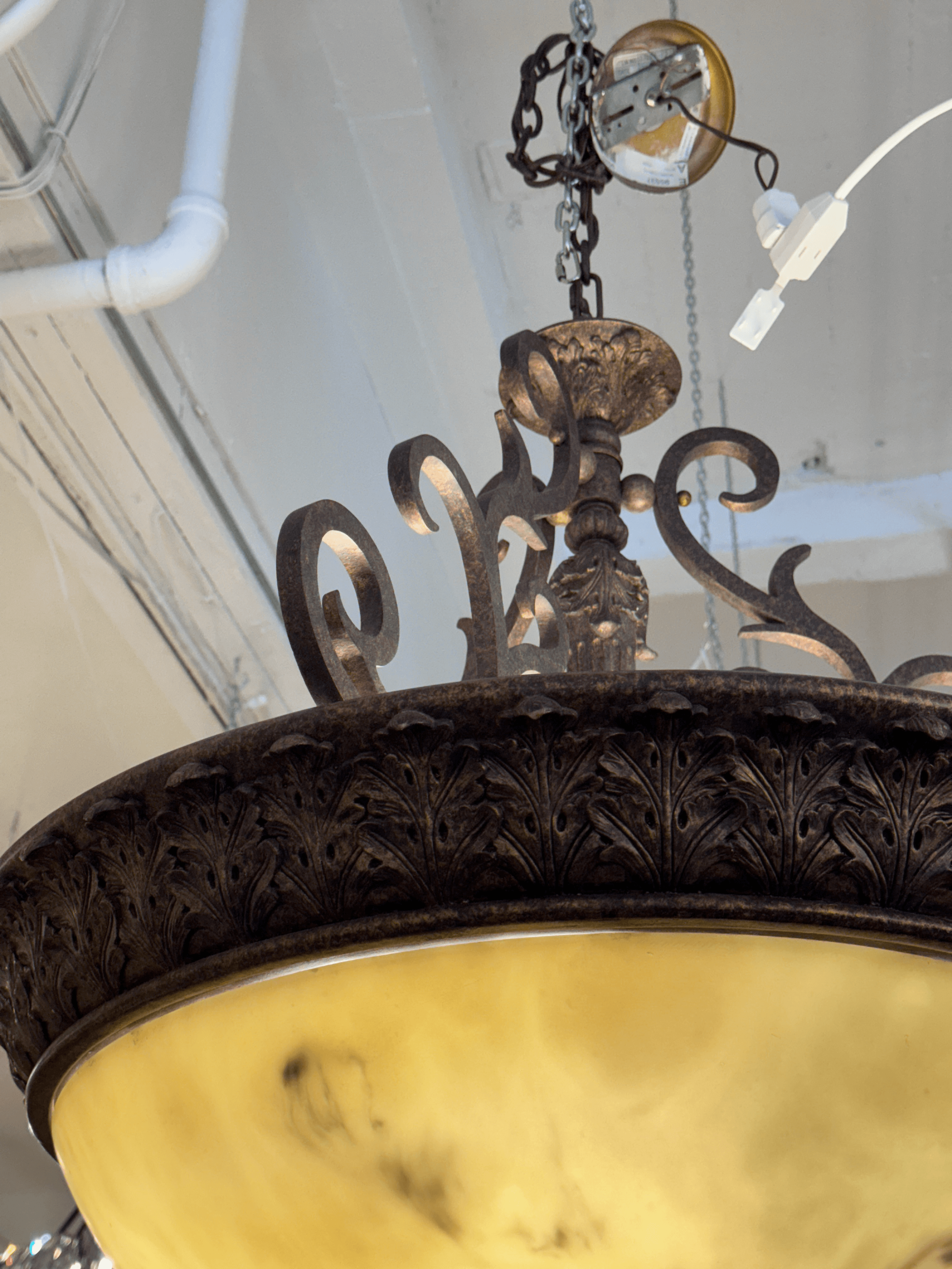 Design Plus Gallery presents an Art Deco Faux Alabaster Pendant Chandelier. This large vintage antiqued brass finish iron alabaster style dome pendant chandelier is full of old-world charm and elegance. The brass iron frame features detailing and a distressed finish, giving it a beautiful vintage look. The dome-shaped alabaster shade is sophisticated and diffuses the light in a warm and inviting manner. The chandelier is grand in size, making it a striking focal point. Its design and rich materials give it a luxurious and timeless appeal that is sure to enhance the ambience of a victorian space. Whether hung in a grand entryway, above a dining table, or in a formal living room, this chandelier is sure to make a statement and elevate the decor of the room. Is in good condition with an antique finish and patina that goes along with age.