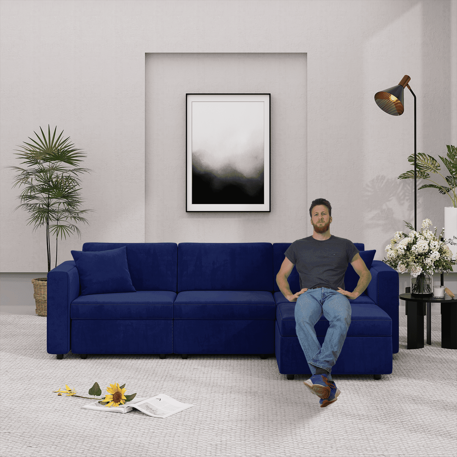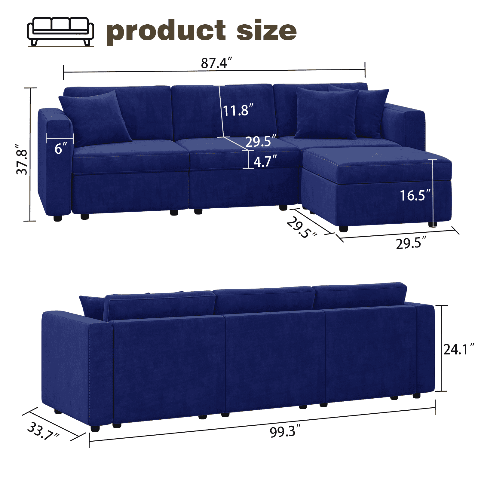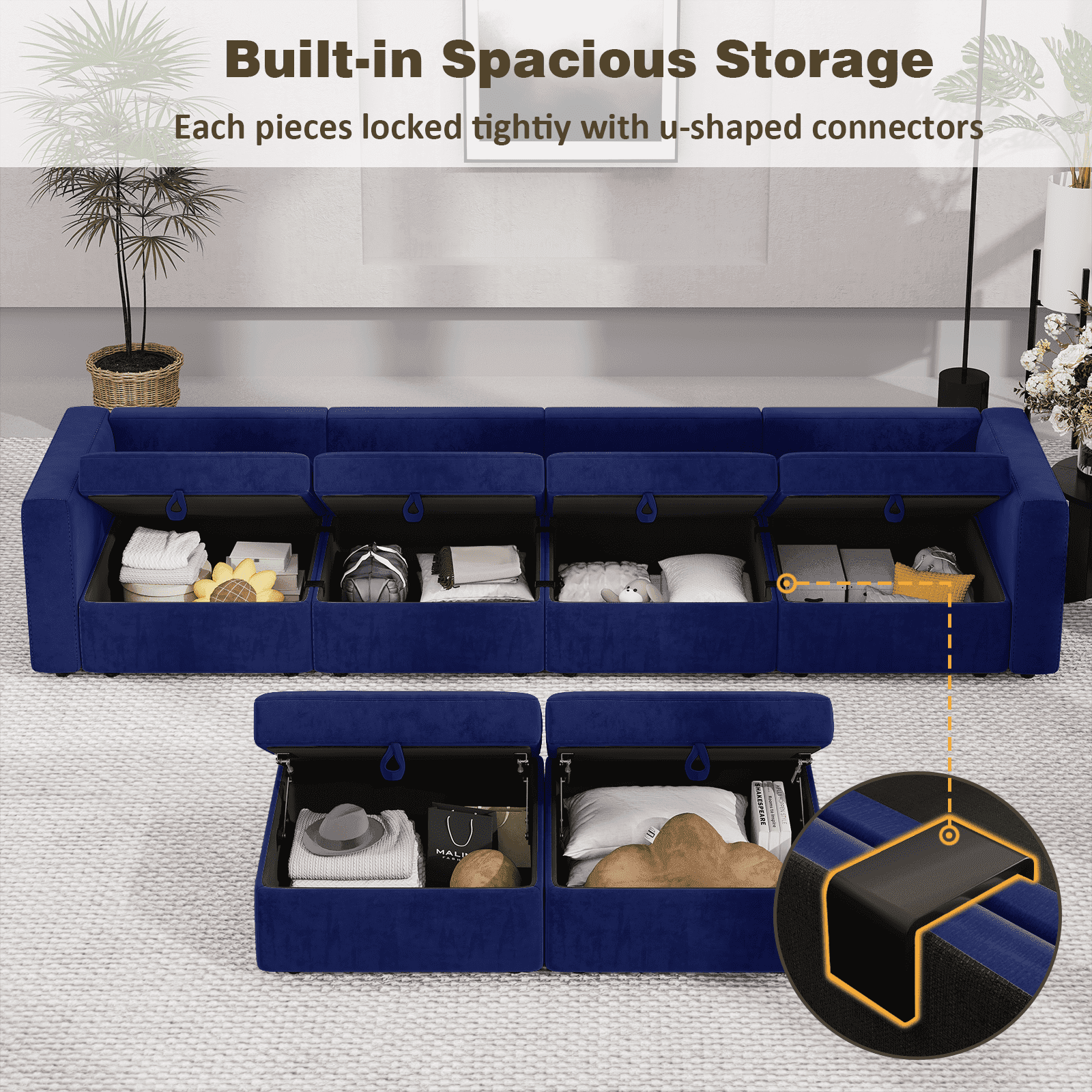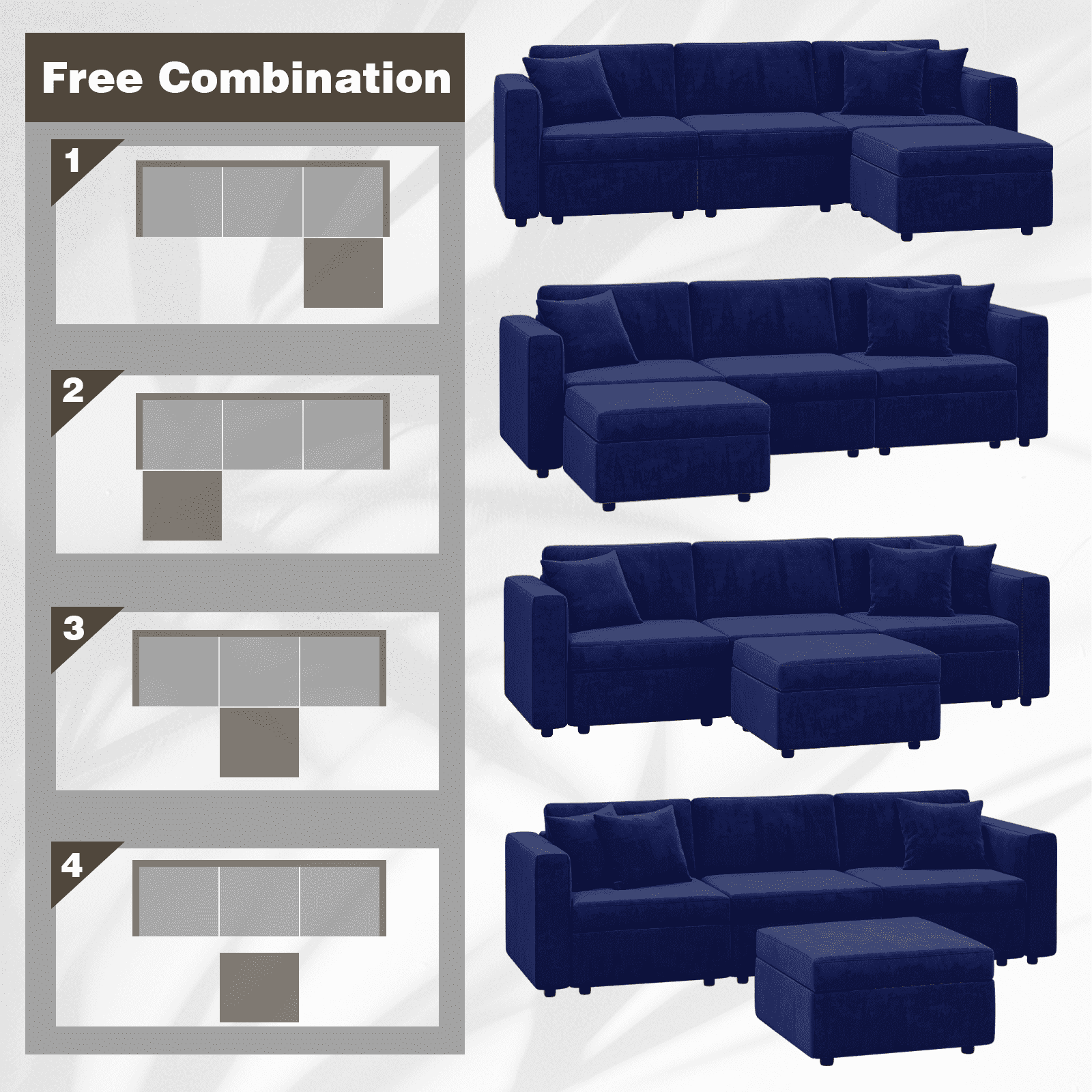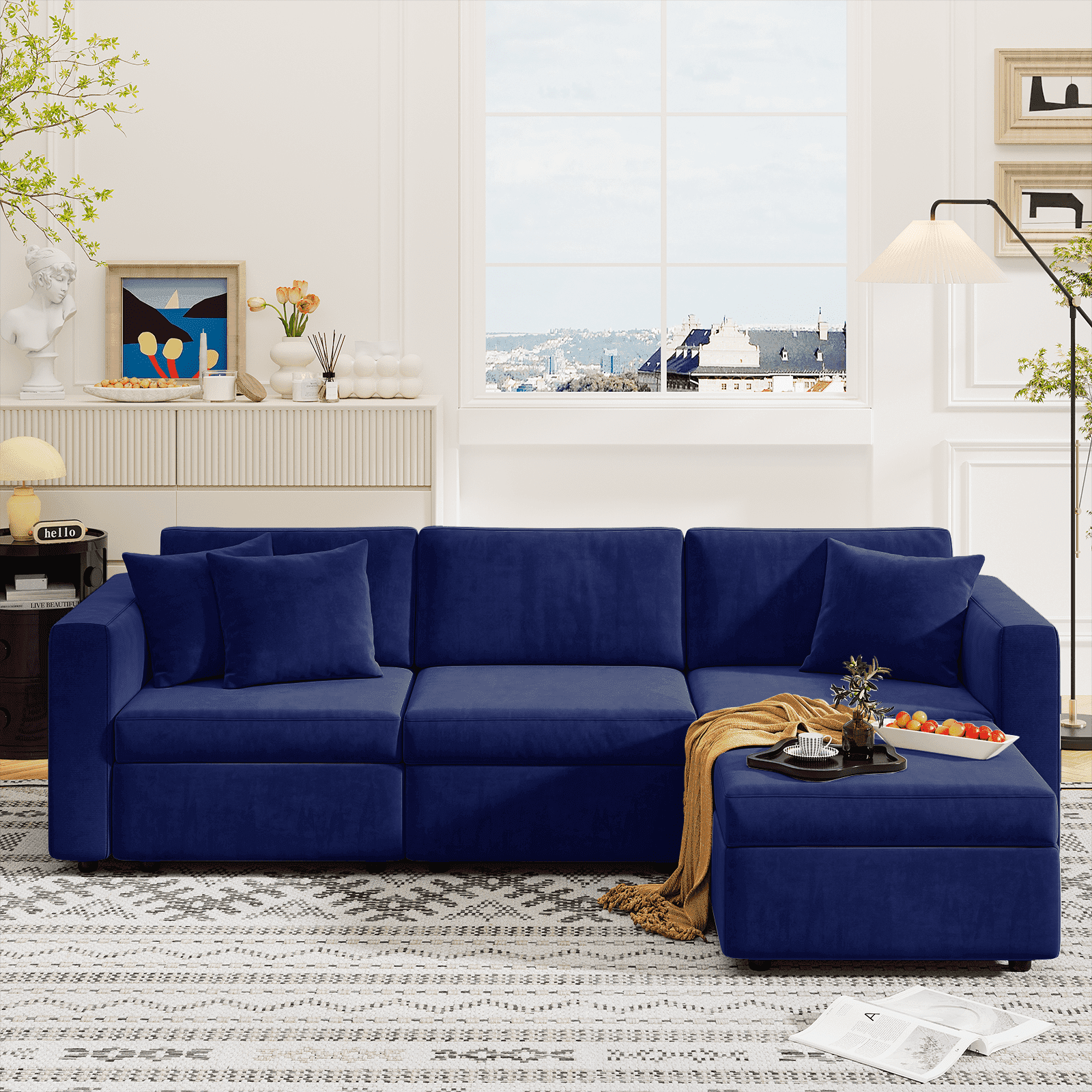Yeahumalia 99.3" Velvet 3 Seater Modular Sofa Upholstered Couch with Ottoman and Seats Storage, Blue