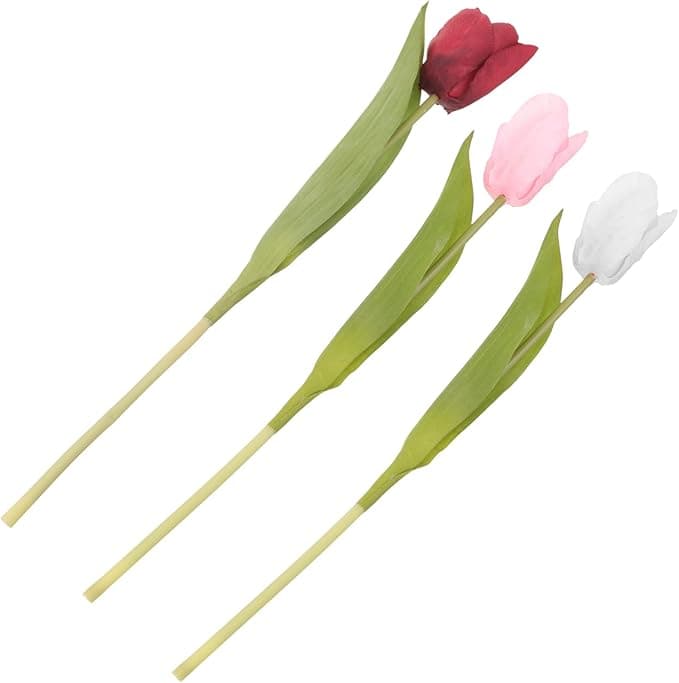 Package List: 3 x Artificial Tulip. Features: -Material: Silk cloth faux tulip flowers -Color: wine red, white, pink, green (stem) tulip artificial flowers -Size: 35.50X5.50X4.00cm/13.95X2.16X1.57in -This artificial tulips is well made to bring the flowers to life. for decorating your home fake plant adorn. -You can make wedding bouquets, props for photography, or give them to your friends as graduation artificial DIY flowers. -for home decoration as living room, bedroom, dining room, study, kitchen table, stage, bar, office, park, wedding, craft making, etc fake flowers for vase. -Stylish home decor that fills your home with natural scenery, very delicate and decorative. Meet your decorating needs spring tulip decor. -Fake flowers are always bloom on them, do not shed leaves, do not wilt, and do not need watering tulip bouquet arrangement.