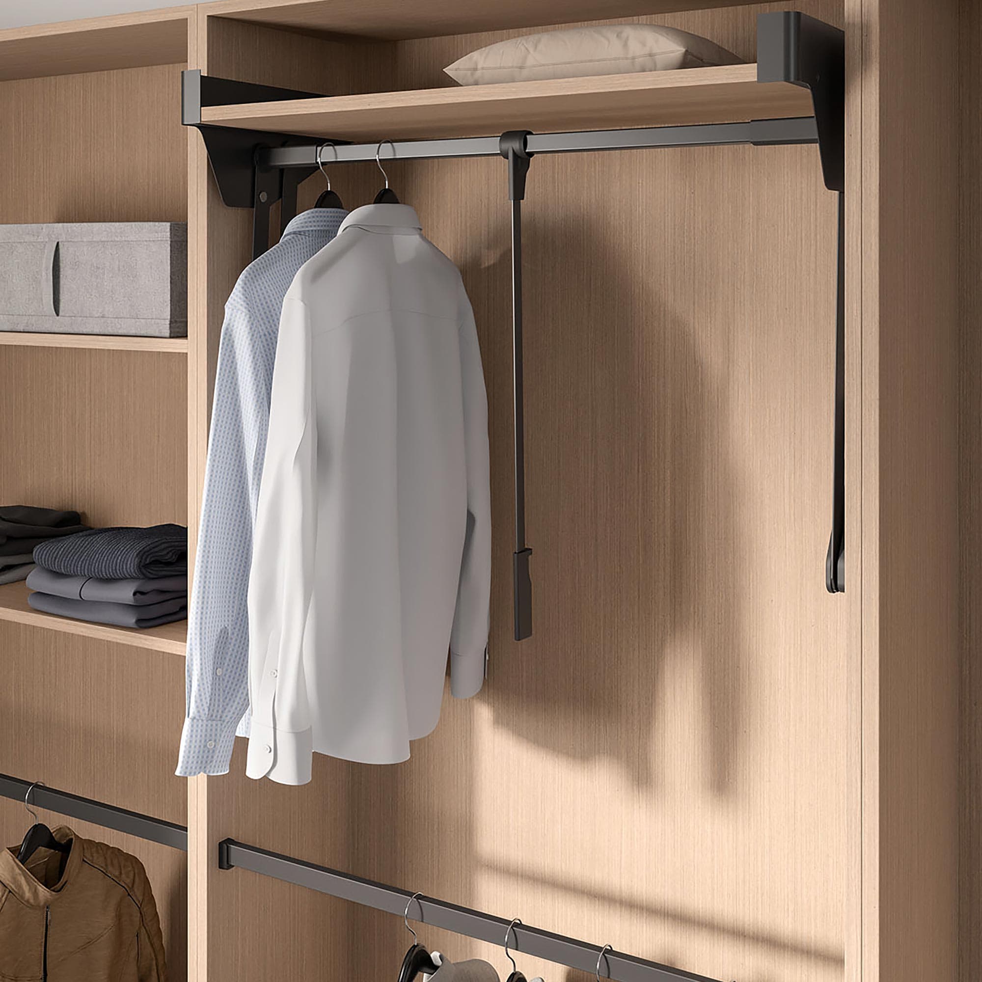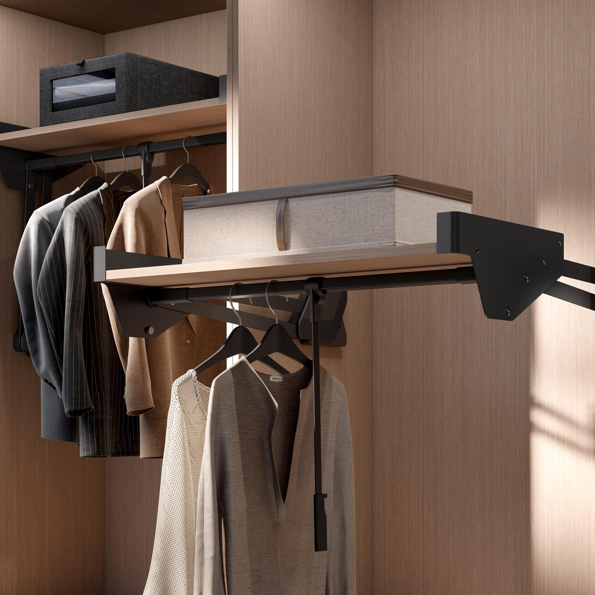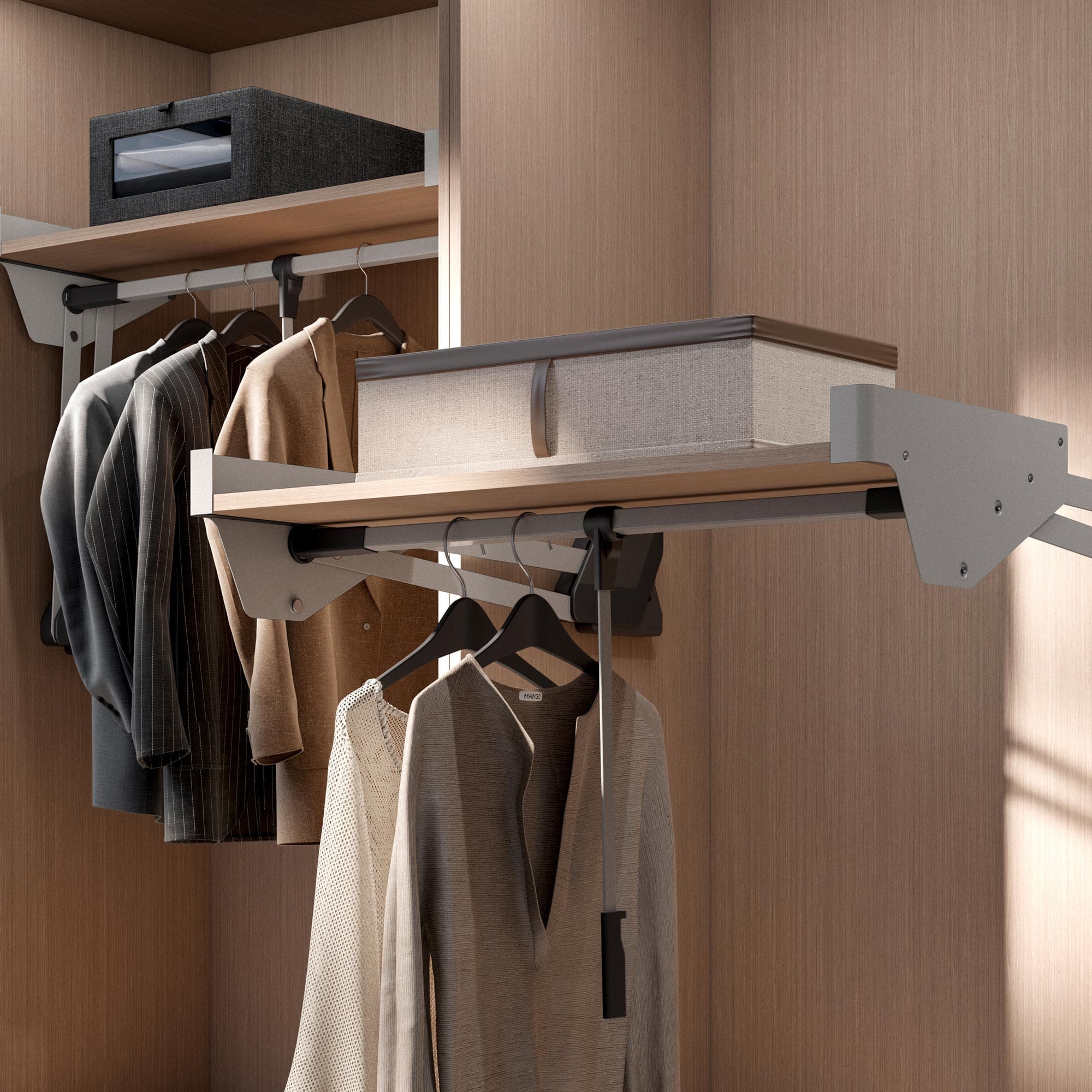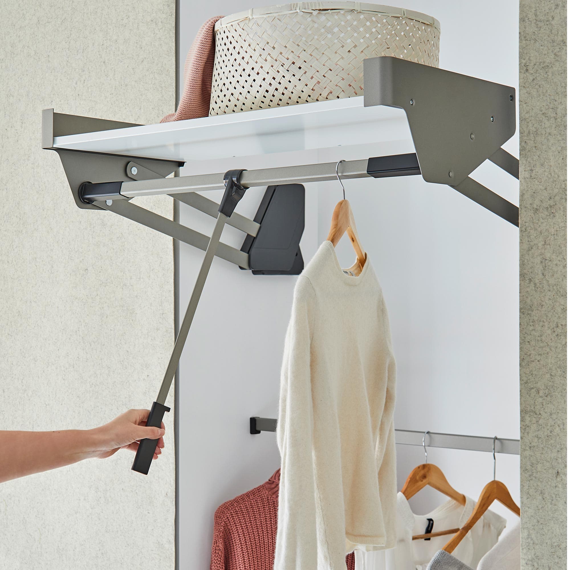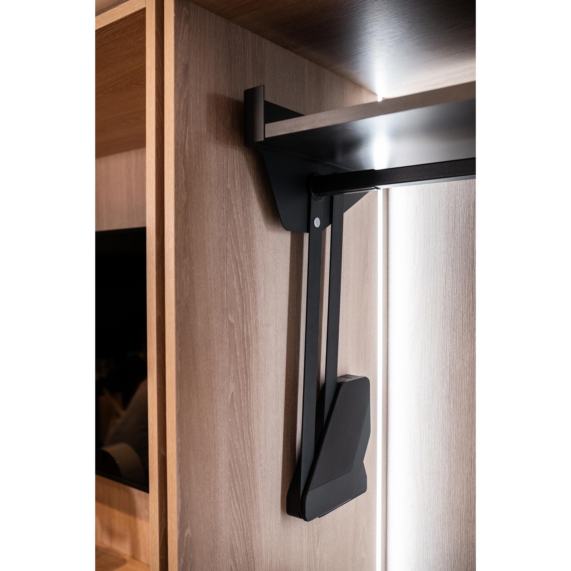 The Kessebohmer Wardrobe Lift TOP enables a shelf to be installed above the clothes rail (shelf not included). This upper storage shelf moves with the clothes rail as one unit, allowing access to the upper shelf and the clothes rail in tandem. Sophisticated technology combines force, stability and aesthetics to deliver effortless performance. The TOP Wardrobe Lift is one of the most functional components on the market. Unlike other wardrobe lifts, the CONERO TOP Wardrobe Lift will still move smoothly even if the load distribution is uneven.