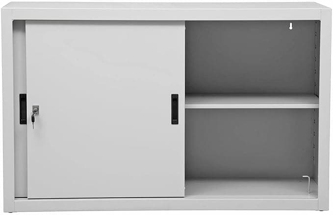 Our steel sliding door cabinets offer plenty of storage space for numerous uses. This version is particularly good as a filing cabinet or suitable for office cabinet, but also in workshop, warehouse or home office, it looks good. The bottom of the shelves can also be used for hanging files. Robust steel body. Electrostatic and resistant powder coating. Sliding doors with quiet special ball bearing wheels. Load capacity of the shelves: approx. 55 kg per shelf. Cylinder lock with two keys. Device for secure wall mounting in the back wall. Delivered fully assembled.