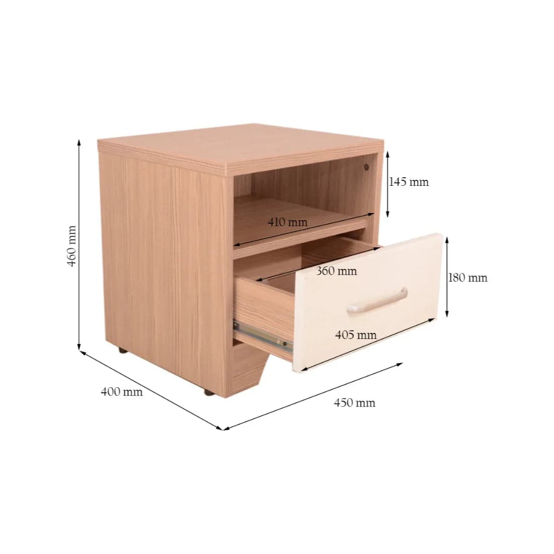 The oak-colored Ambra nightstand with natural wood grain finish breathes freshness with its light texture and modern silhouette. The distinct high gloss white drawer shutter with open top storage makes it an efficient pair to the bed.
