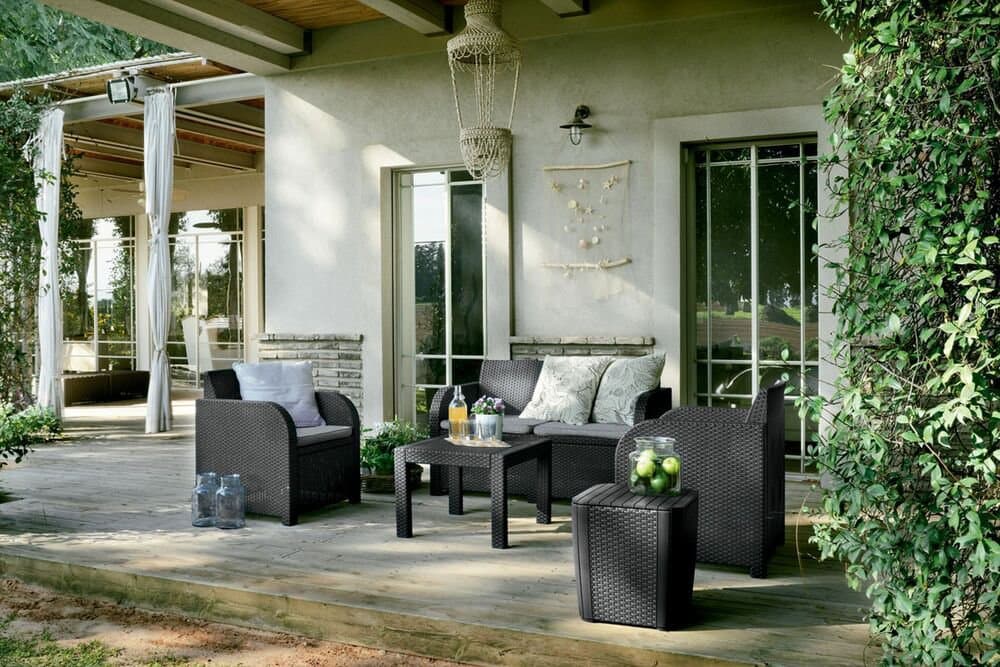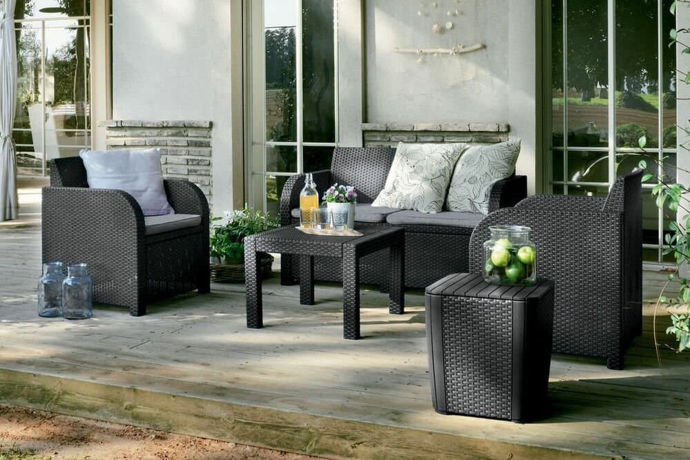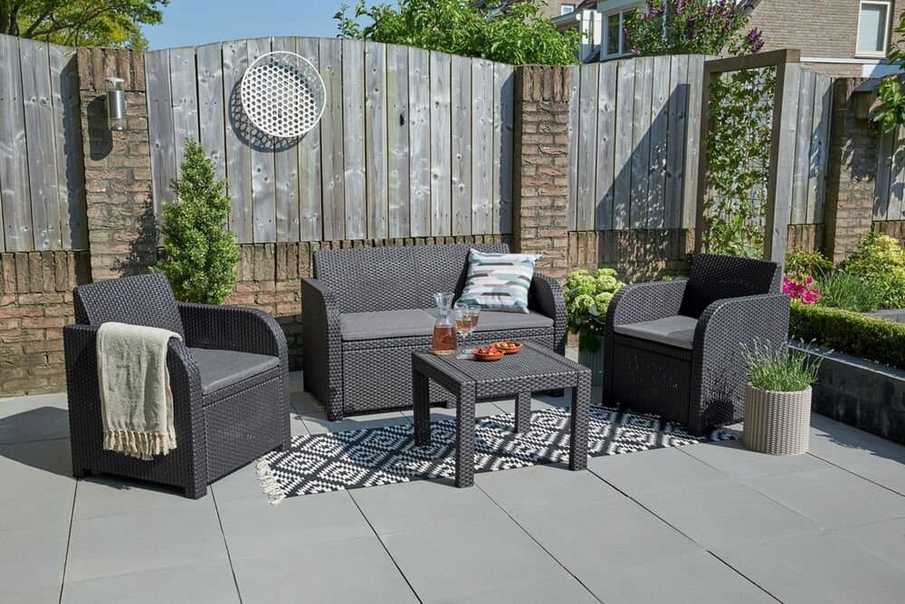 Do you dream of creating an elegant corner in your garden that will delight your guests with its appearance and provide unforgettable moments of relaxation? The Georgia garden furniture collection in graphite color is the perfect solution for you! Consisting of two armchairs, a two-seater sofa and a square table, the four-seater Georgia series impresses with a unique design reminiscent of rattan wickerwork. The set is resistant to damage and the long-term impact of weather conditions and UV radiation. What's more, soft pillows in elegant colors and an easy-to-clean design make Georgia furniture not only beautiful, but also practical. Are you ready to enjoy comfort and elegance in your garden for many years?