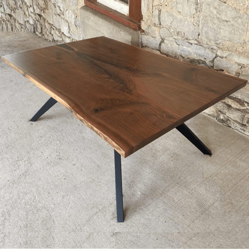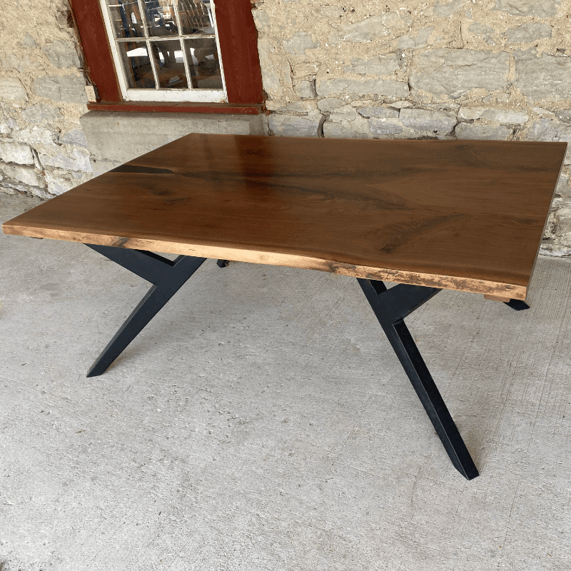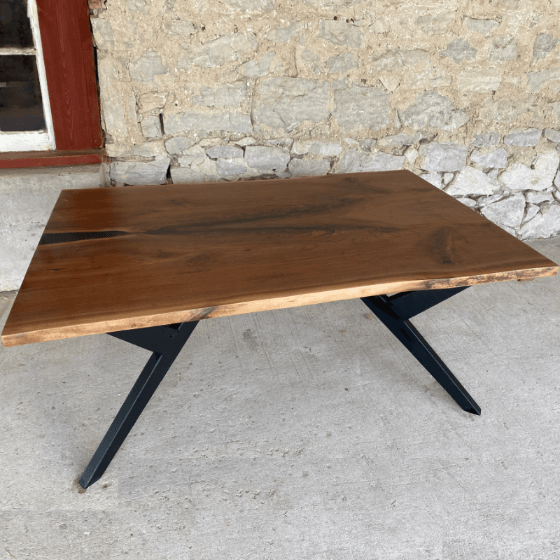 This live edge walnut dining table is a statement of sophistication and natural beauty. The darker heartwood, enriched with black epoxy, creates a captivating contrast and adds a touch of modern elegance. The table is meticulously book-matched, showcasing impressive tiger tailing patterns that enhance the overall visual appeal. With dimensions measuring 78″ in length, 47″ in width, and a substantial 2″ thickness, this dining table provides a generous and inviting space for gatherings. The live edge design along the sides adds a rustic and organic touch, emphasizing the natural contours of the walnut wood. For a personalized touch, the table offers the flexibility to pair with your choice of a powder-coated base, sold separately. This feature allows you to tailor the table to suit your specific style and preferences, further enhancing its versatility. This live edge walnut dining table is not only a functional piece for shared meals but also a work of art that brings together the richness of walnut wood, modern aesthetics, and thoughtful design.