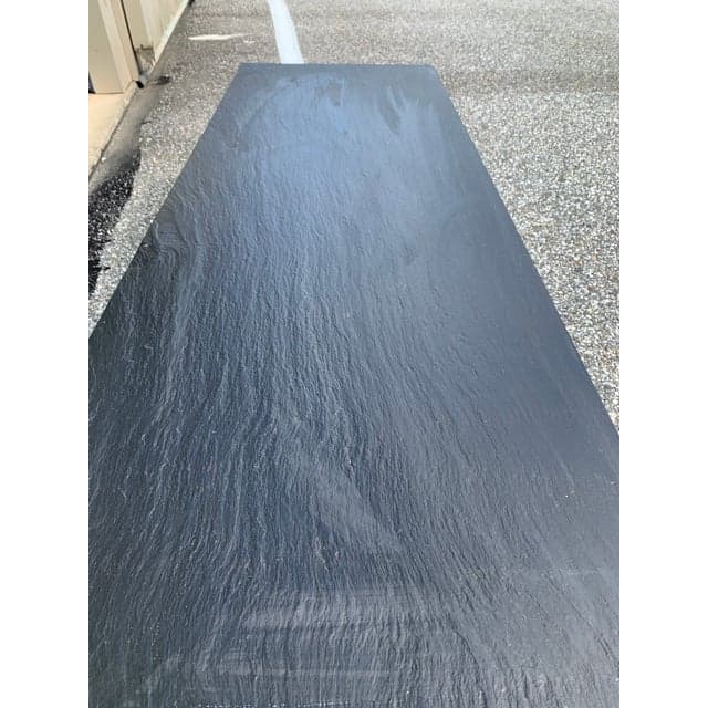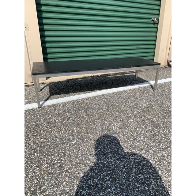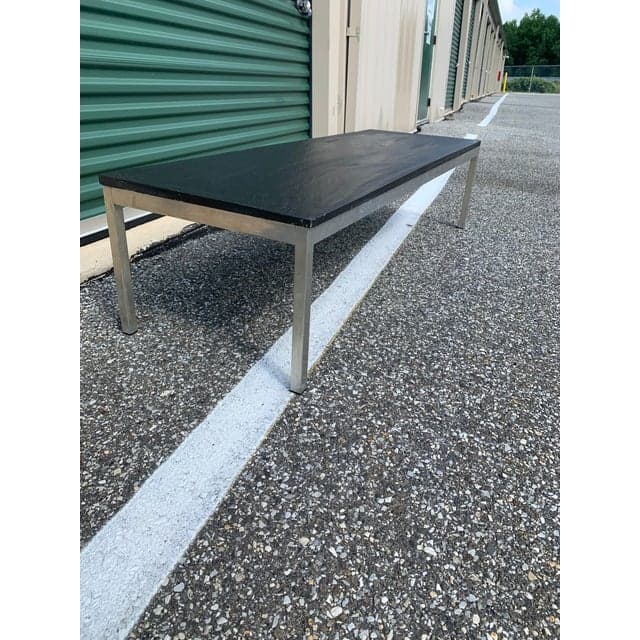 Aluminum table base with thick dark grey slate. Made in the 1960s.