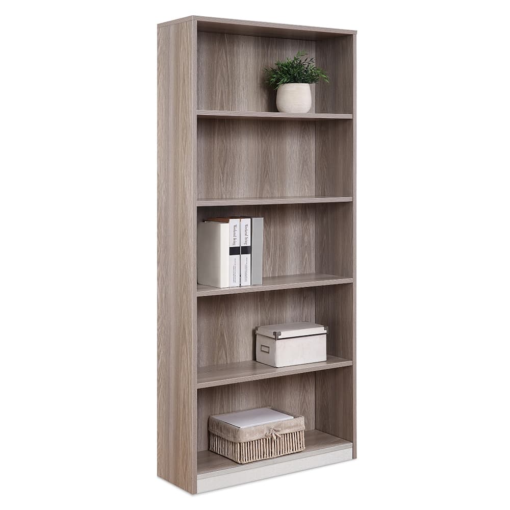 The versatile At Work collection offers a practical solution for any office. This five-shelf bookcase provides open storage for books or decor in your office, conference room, or reception area. It pairs well with other pieces from the collection. A brushed metal band at the base complements the modern laminate finishes. The scratch and stain-resistant laminate ensures it withstands everyday use.