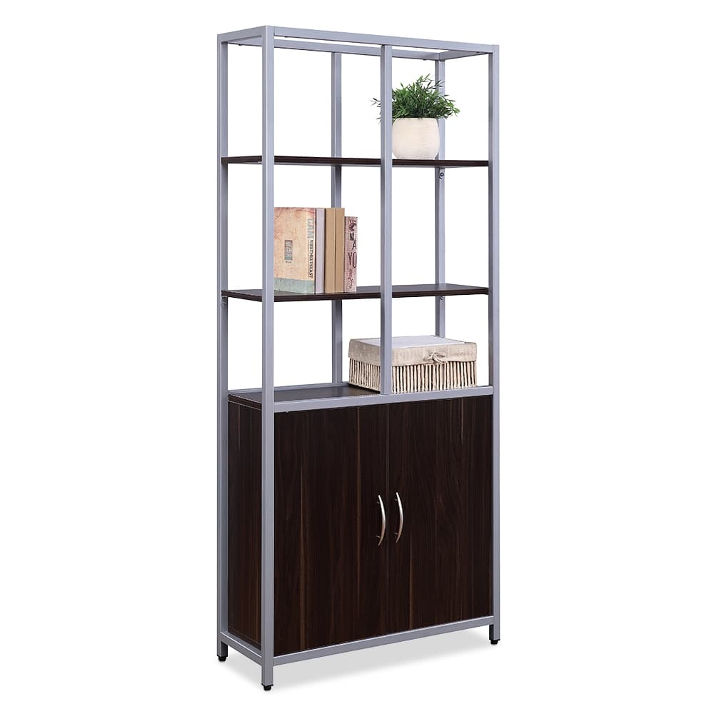 A clean and minimalist take on the traditional bookshelf, designed to fit seamlessly into modern offices and meeting spaces. Open ends and sturdy metal supports add to its functionality. Laminate shelves are durable and resistant to scratches and stains. The bookcase has five shelves, with three open shelves at the top and two shelves behind doors at the bottom. Assembly is required. Dimensions: 72"H. Clearance item, final sale.