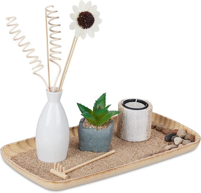 Relaxdays Juego Portavelas Jardín Zen, Bandeja para Velas, Arena y Piedras, Planta Artificial, Decoración de Hogar, Multicolor, Tablero de Fibras, 26 x 34 x 17,5 cm