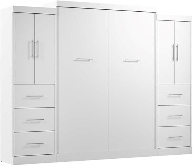 The Atlin Designs queen Murphy bed with 2 wardrobes (115W) is the ideal space-saving bed. The wall bed accommodates most standard queen mattresses. Both closet organizers come with 2 fixed and 3 adjustable shelves as well as 2 clothing rods, 3 drawers, and 2 doors. The dual-mount wall bed mechanism attaches to the floor and wall for ease of assembly and maximum stability and durability. To avoid risk of injury, the Murphy bed must be installed to wall and floor structure by a professional or qualified person. Two people are required for assembly. Installation requires attachment to wood studs or masonry, removal of the baseboard, and drilling into the floor. Necessary hardware is included. Do not use this product for children or pets under 50 pounds (22.7 kg). North American made with globally sourced materials.