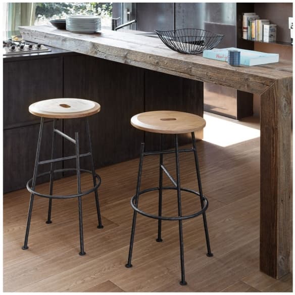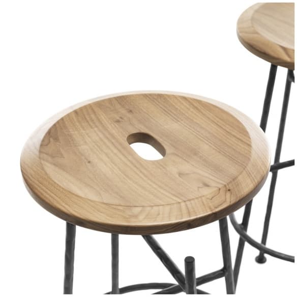 Sbagliato stool made of wrought iron with seat in solid Canaletto Walnut. The iron structure has a cut which is functional for putting bags or jackets while seating. The wood seat, instead, is very comfortable because of the hollow, unlike the other stools. Designed by NÆSSI STUDIO for Mogg. Sbagliato means Wrong and in fact it’s the stool whose design does not match the expectations: three slender metal legs reach the seat, while the fourth remains suspended, becoming, if necessary, a hook for the bag or for a jacket. Sbagliato subverts traditional stool concept, combining the function of sitting with free interpretations not expected by the designer.