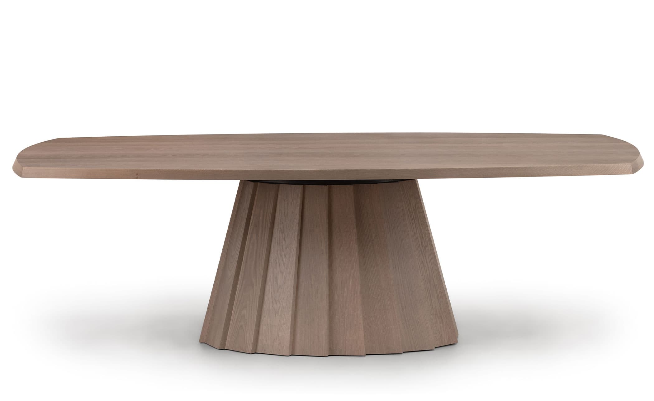 Orion, named after the most recognizable constellation in the night sky, artfully explores the concept of repetition with a central leg made from a series of overlapping solid wood slats forming an oval shape. Expressing contemporary artistry, this table has a sculptural form imbued with the warmth of solid wood, bringing interest and a generous gathering place to any dining room. Crafted at the solar-powered De La Espada factory in Portugal. Designed by a creative partner and rigorously engineered with the support of the De La Espada product development team and expert craftspeople. Durability, comfort and aesthetics combine for a product that lasts a lifetime. Timber is sustainable solid wood from North America or Europe, offering long-term repairability of the surface. Natural color and grain variations in every plank make each piece an individual. Traditional wood joinery bonded with wood glue ensures structural integrity. All finishes are non-toxic and applied by hand, sprayed or rubbed.