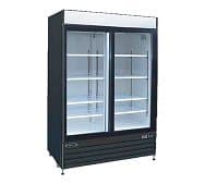 Kool-It Refrigerated Merchandiser, 40.8 cu. ft., 52-2/5"W x 31-1/2"D x 79-1/2"H, (2) sliding locking glass doors, 33° to 40°F temperature range, digital thermostat with LED display, white baked enamel interior with (8) adjustable shelves, interior LED lighting, top lighted signage panel, black powder coated steel exterior, bottom mount self-contained refrigeration, R290 refrigerant, (4) casters (2) locking, 1/4 HP, 115v/60/1-ph, 3.3 amps, cord with NEMA 5-15P, cETLus, ETL-Sanitation.
