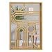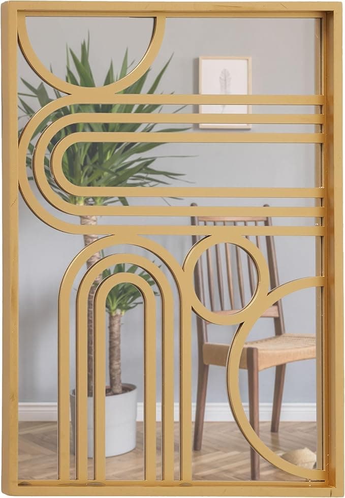 With a nod to Mid-Century Modern design, this rectangular mirror offers a play on geometry with curved arches, semi circles and circles within the overlaying golden metal lattice work. Crafted of brilliant mirror glass with mdf wood finished in golden gilt paint. Well sized, this rectangular piece measures as follows: 11.5 W x 15.75 H inches, 2 lbs (20 L x 29 W x 40 H cm, 900 grams) The slim, the profile from the wall is .75 inches. Ideal to add to your gallery wall at home bringing understated dimension to your space. Reflect nothing but great taste when walls are enlivened with this exquisite accent mirrors. Position horizontally or vertically to suit your walls. It arrives with sawtooth hangers on the back for easy installation.