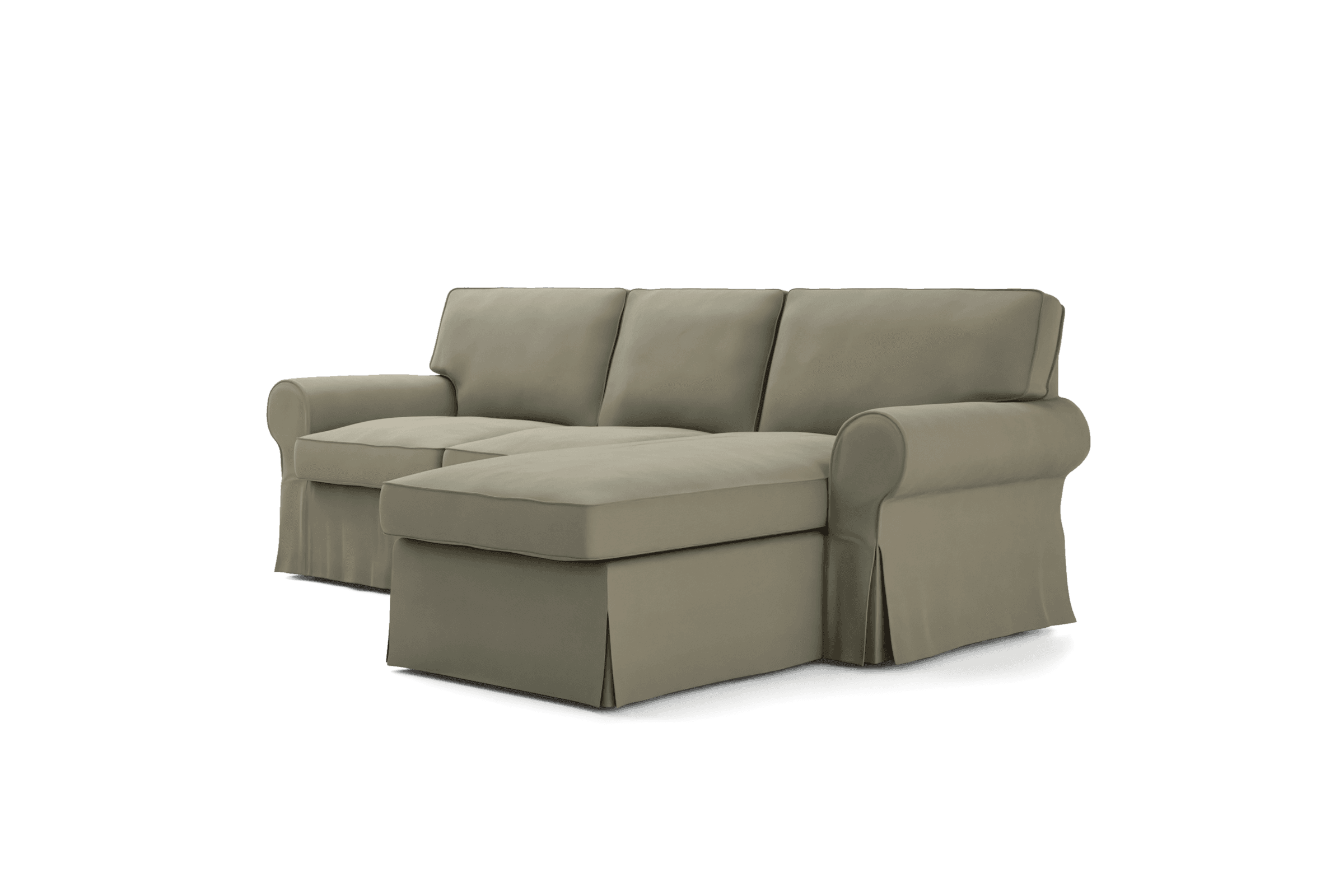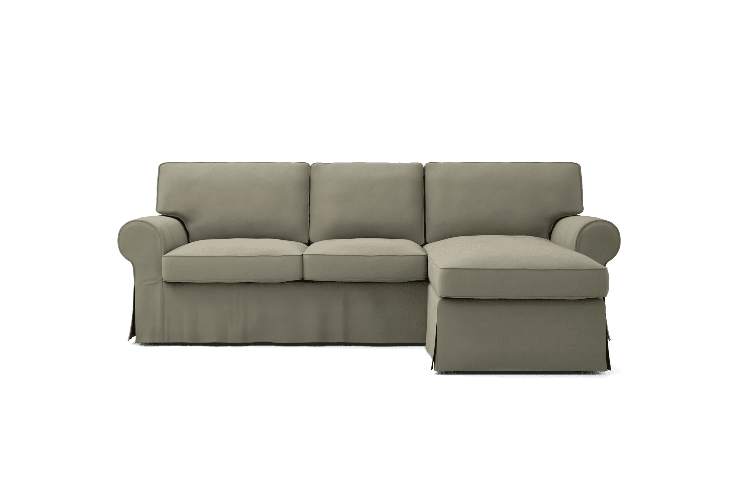 This Ektorp cover comes with piping for a classic look that resembles the original IKEA Ektorp cover. It includes 8 pieces: 1 frame cover, 3 back cushion covers, 2 seat cushion covers, 1 frame cover for the chaise longue, and 1 chaise longue cushion cover. The chaise longue can be used on the left, middle or right side. The cushion covers are closed with zippers and are reversible. Regular Fit, Organic Panama Cotton, Seagrass.