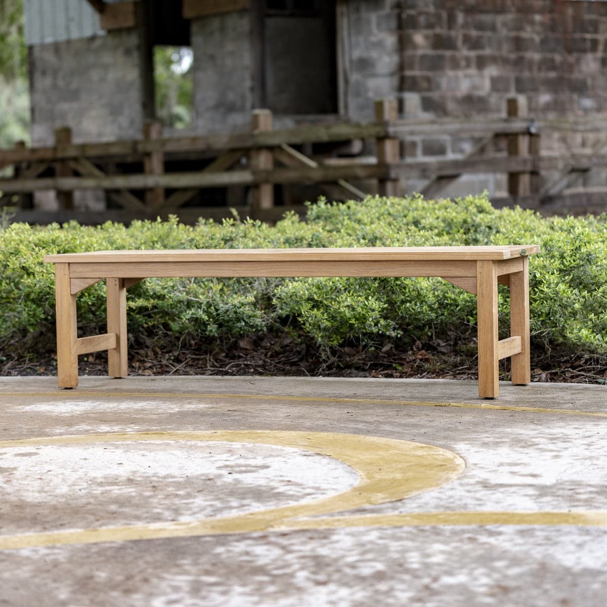 The Veranda Backless Bench from our popular Veranda Collection blends classic charm with versatility. Ideal for entryways, mudrooms, patios, or paired with a dining table, this teak bench offers timeless elegance and practicality. Available in 5 ft length and featured in various sets, it's crafted from 100% Grade A Teak sourced sustainably from Indonesian plantations. Designed for comfort and durability, it includes optional cushions with Quick Dry Foam® core and Sunbrella fabrics. Backed by a lifetime warranty, it supports up to 500 lbs and requires 2.50 yards of fabric for COM cushions, with an additional 20% for striped or patterned fabrics.