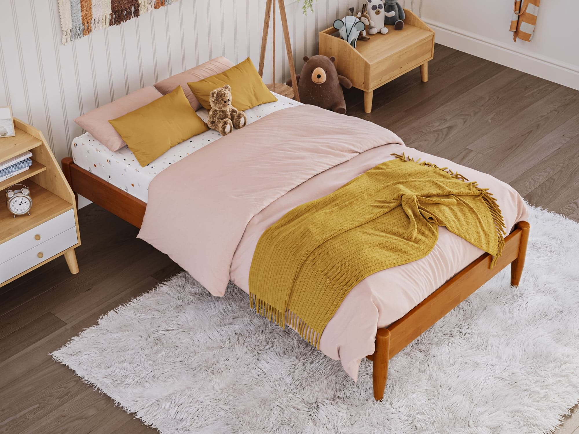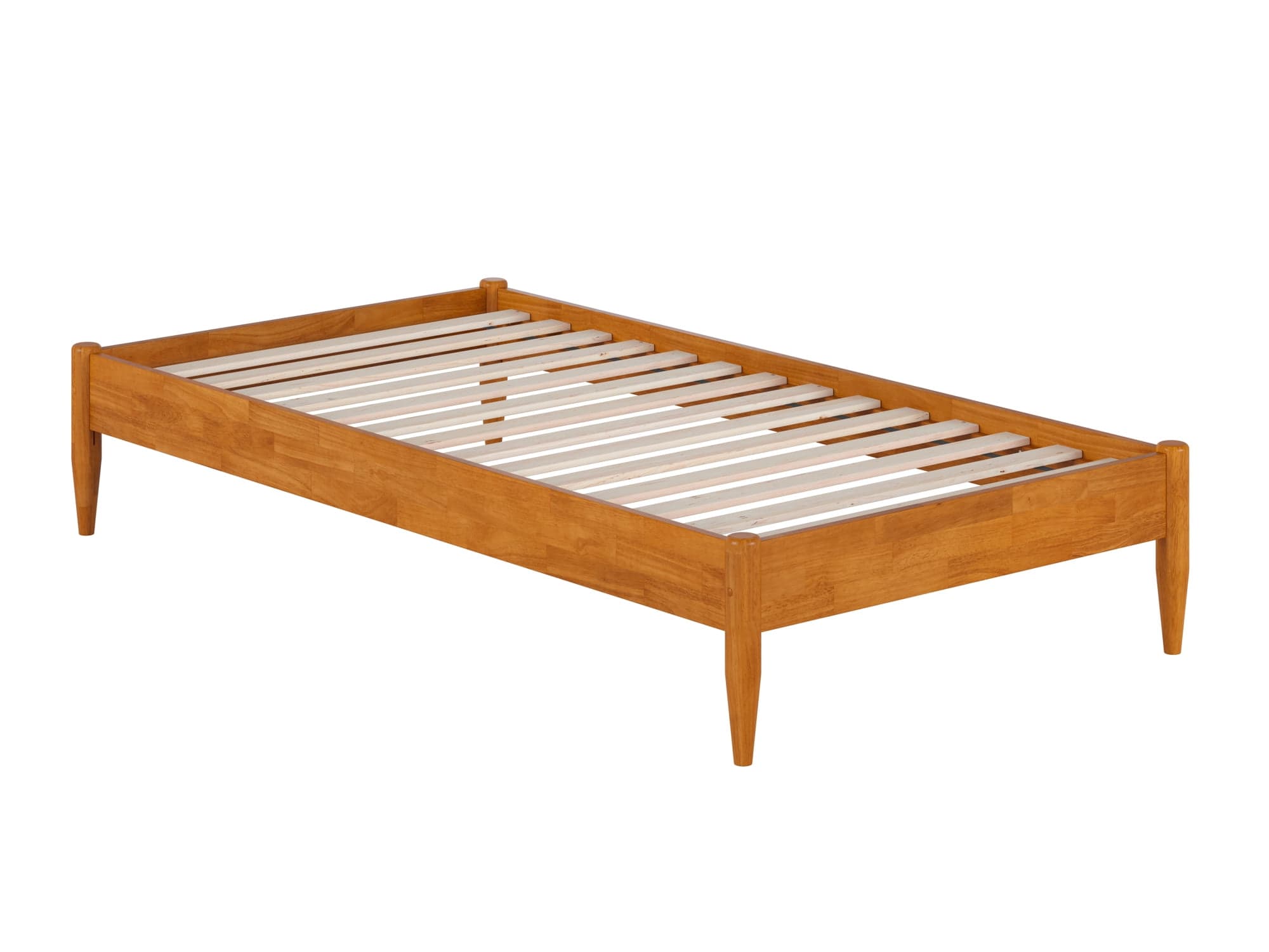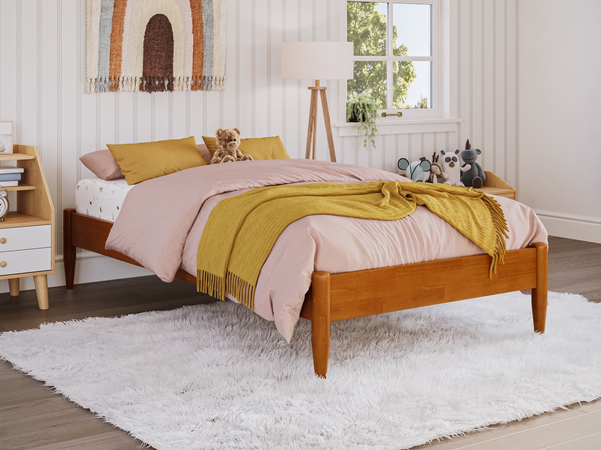 AFI Pasadena 14" Twin Platform Bed Frame in Light Toffee. Durable Design: Sturdy frame is constructed with Solid Hardwood and a Non-Toxic Finish for longevity. Ample Underbed Storage: Provides 14 inches of total height, including 8.35 inches of clearance space beneath the bed, perfect for storing odds and ends.