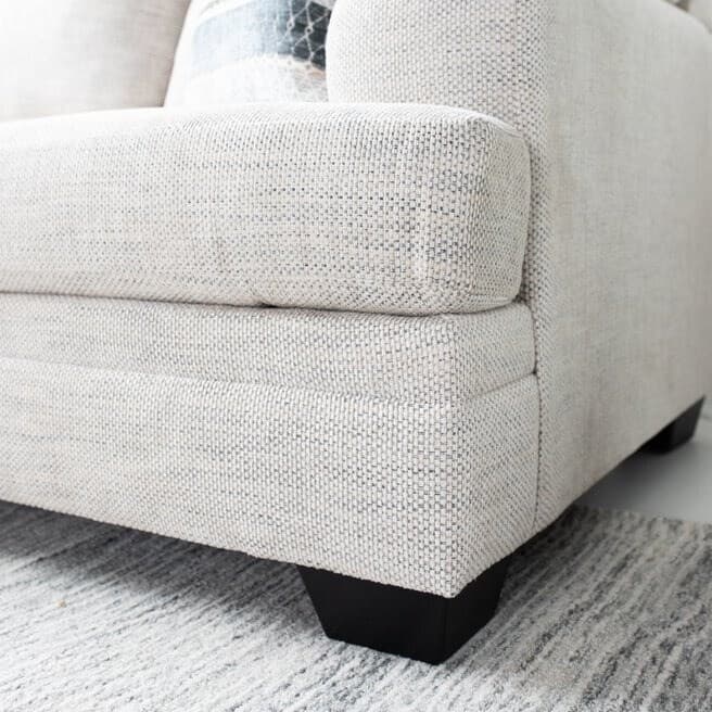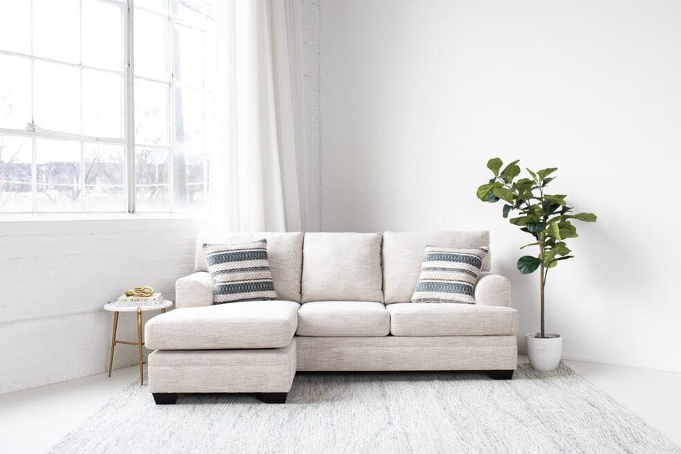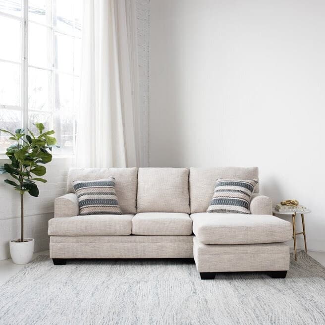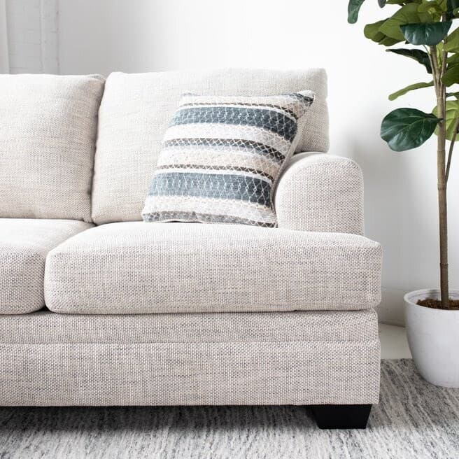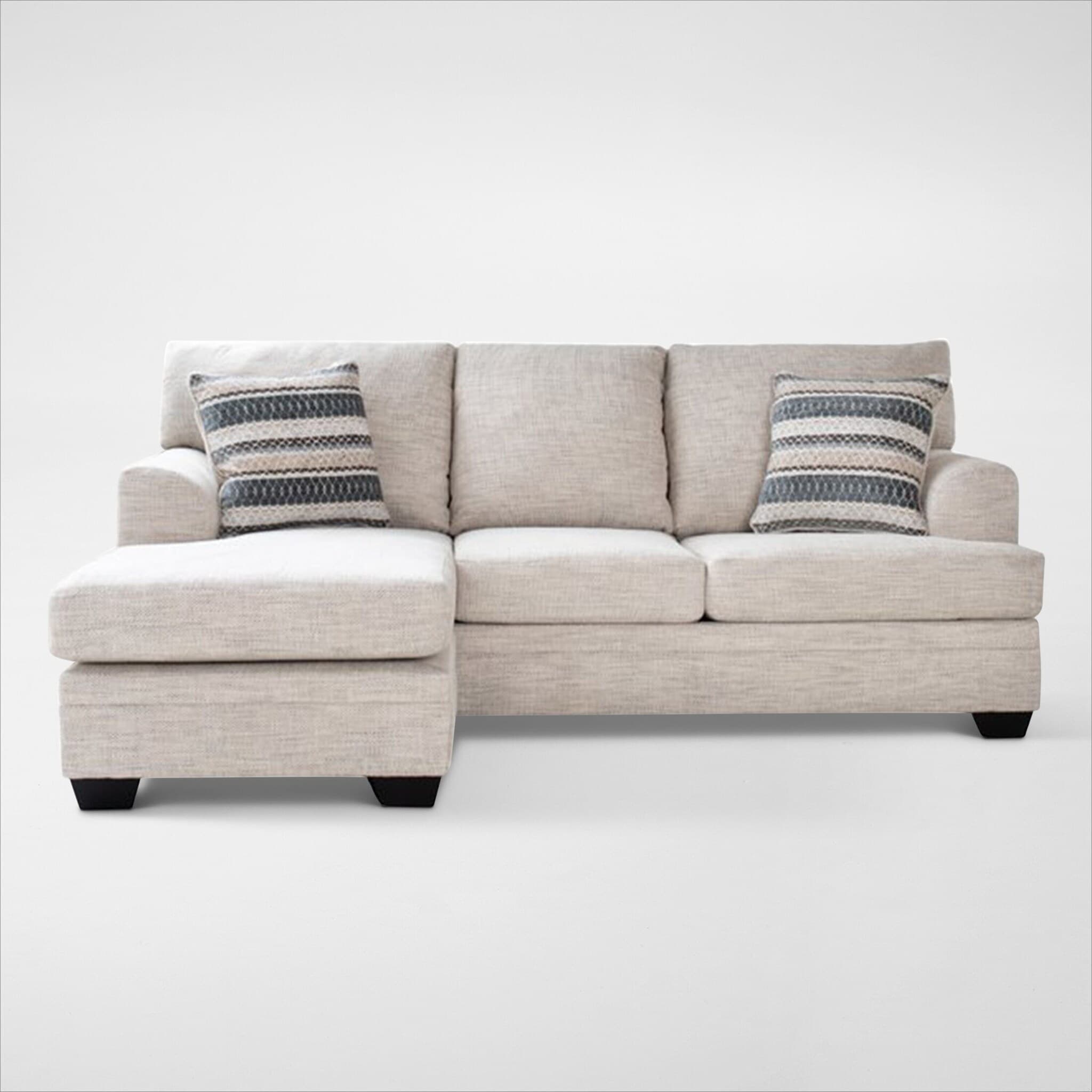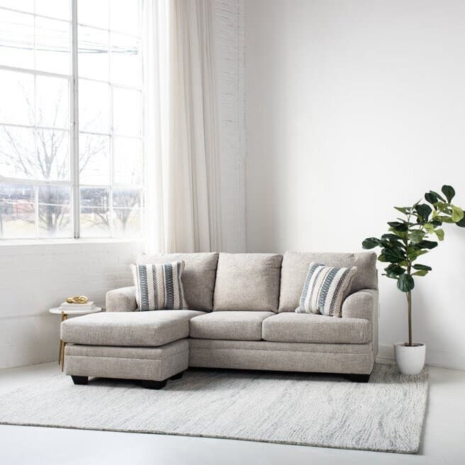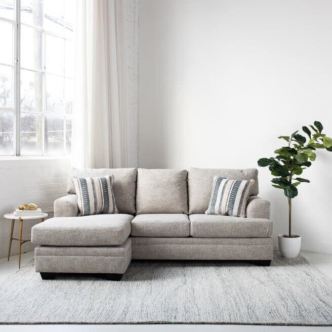 The sofa-chaise combo of your dreams. The Mabella Sofa with chaise is an invite to indulge in everyday comfort with its soft fabric, foam cushions, and bonus accent pillows.