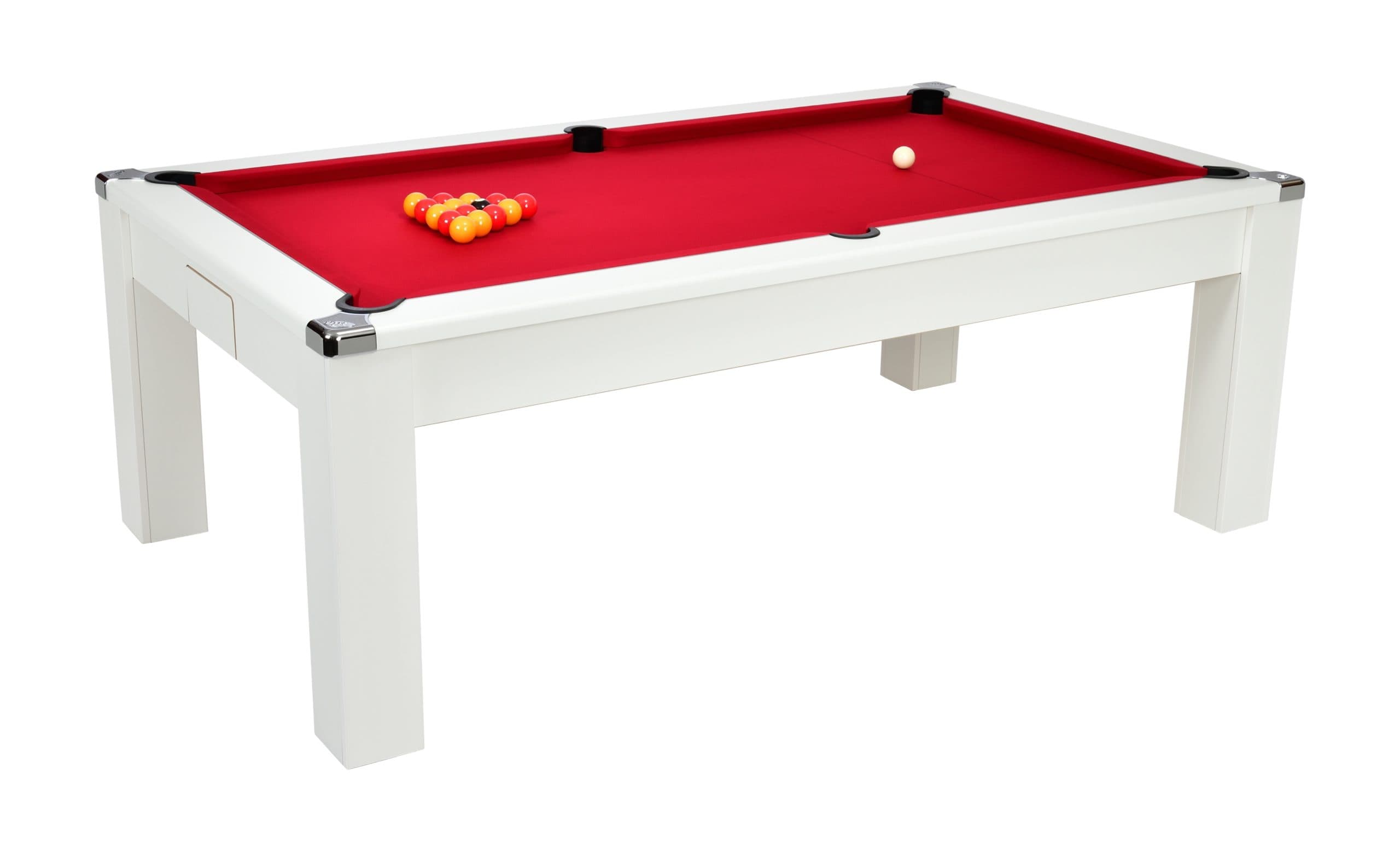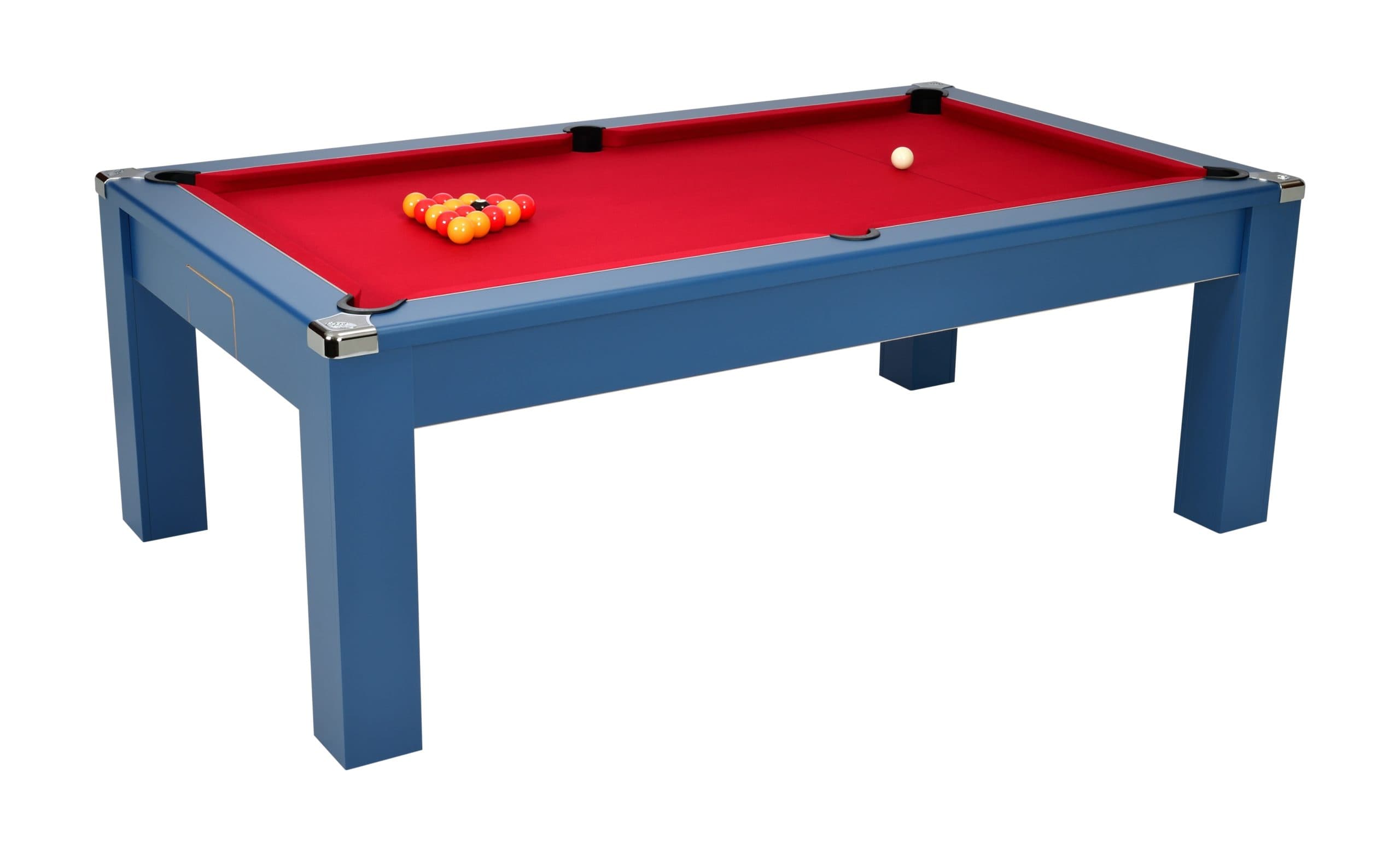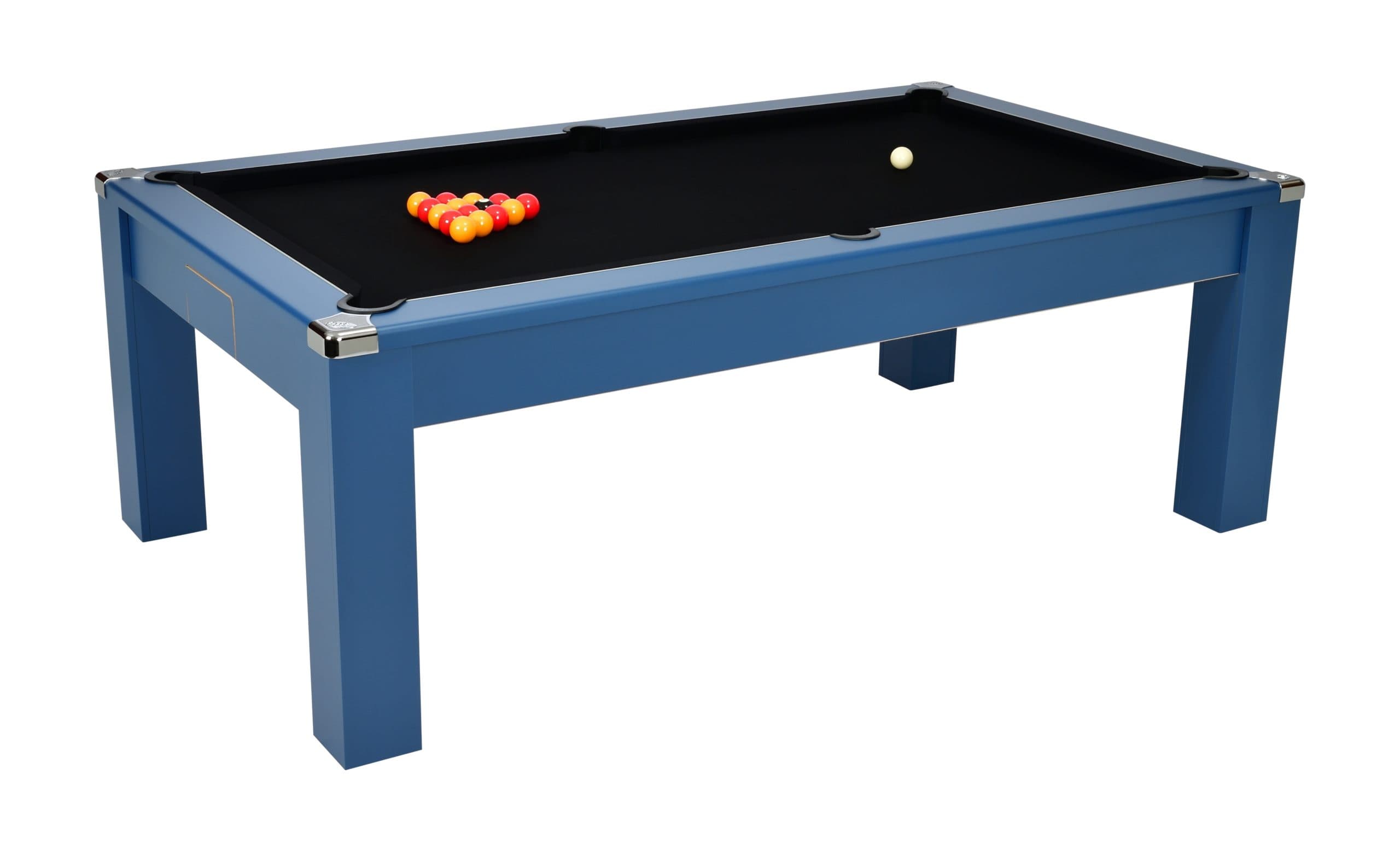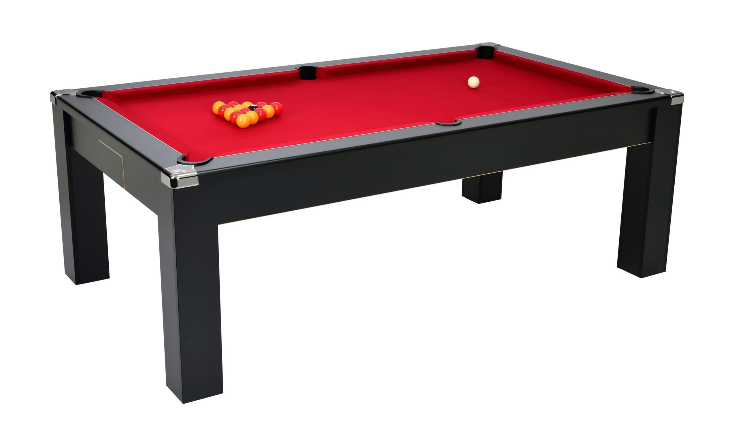 The D.P.T Avant Garde Pool / Dining Table is manufactured in the UK and is suitable for domestic locations. Available in a choice of cabinet finishes and Strachan West of England cloth colours. You can also choose between 6ft and the popular 7′ (standard league size) table options. Complete with a two piece matching dining table top. Supplied with Aramith Red and Yellow balls, 2x cues, triangle and chalk.