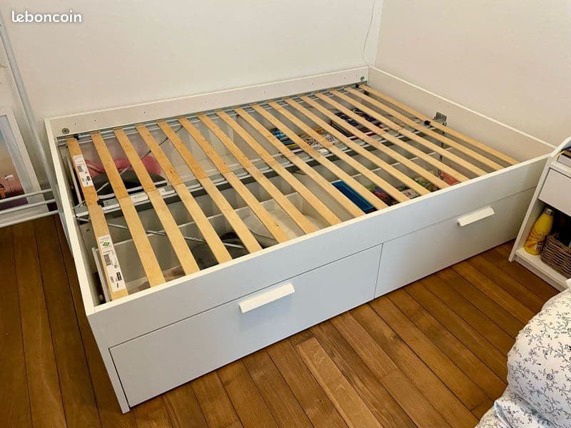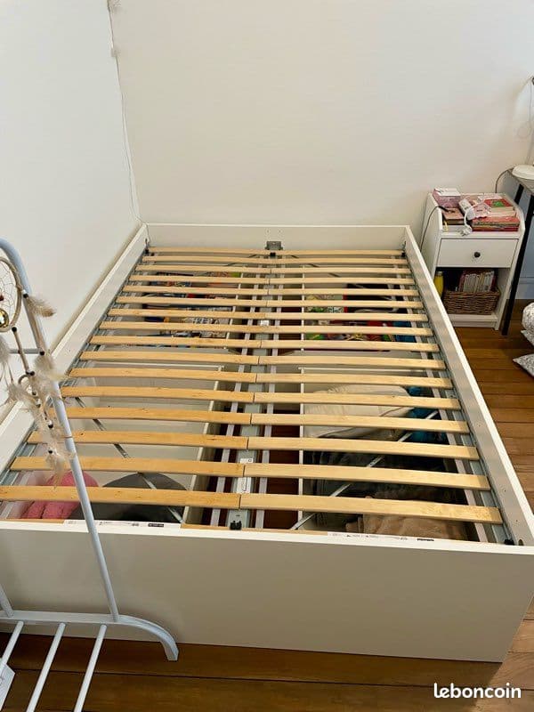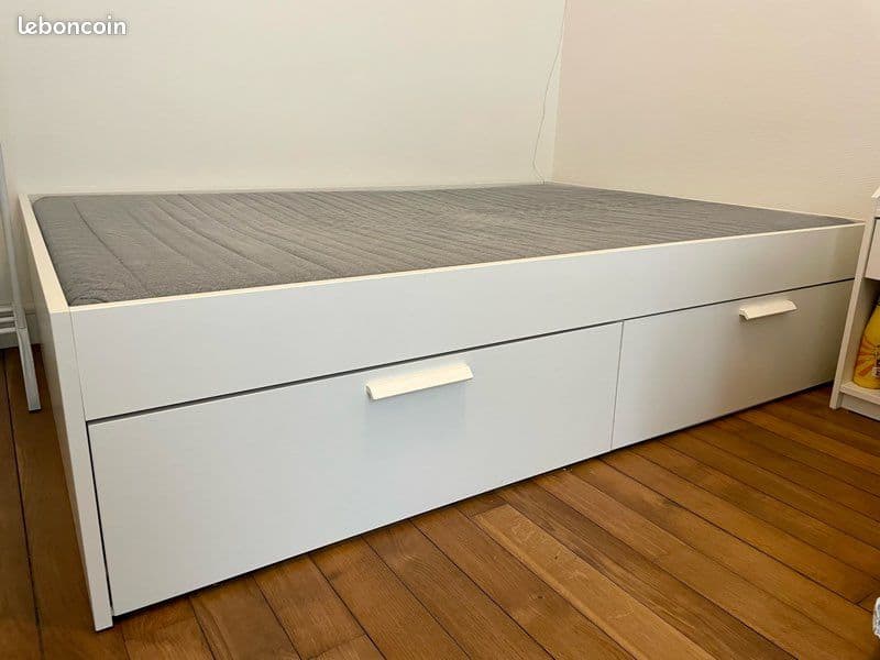 Vends lit complet 140x200cm IKEA en très bon état (déménagement). Le lot comprend : - 2 sommiers à lattes LUROY (valeur neuve : 50€). - Un cadre de lit BRIMNES blanc avec rangements intégrés (4 tiroirs de rangement très pratiques) – valeur neuve : 189€ - Un matelas en mousse ATGONES (valeur neuve : 69€) OFFERT dans le lot. Valeur totale neuve : 308€ Vendu 160€ le tout. À venir récupérer sur place.