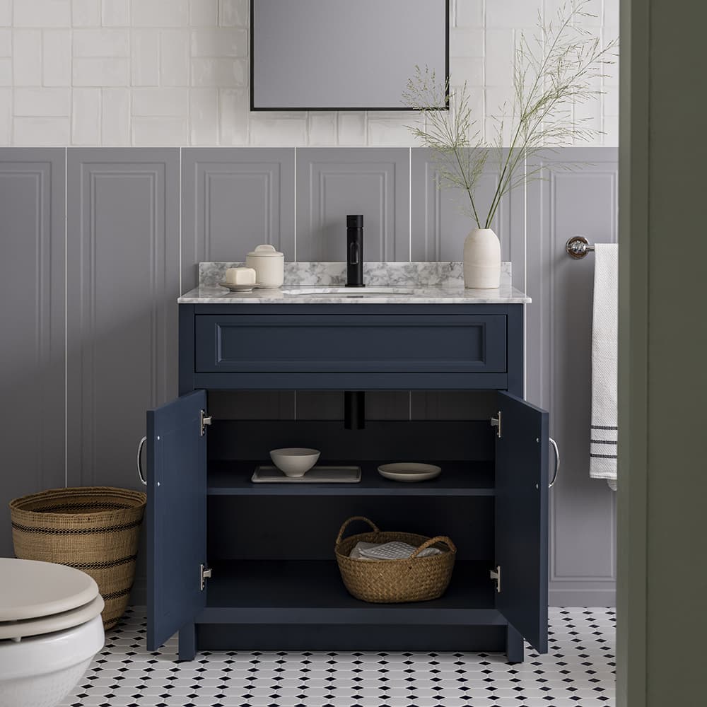 The Chatsworth traditional 810mm wide blue vanity unit with marble basin top, Victorian inspired design with a modern twist. The Chatsworth range of charming bathroom furniture features classic styling with a satin blue finish cabinet and tongue-and-groove side panelling. Internal shelf provides generous storage space for your toiletries, helping to keep your bathroom clutter free. Manufactured to a high standard, the inspired Chatsworth range of luxury furniture with its clean minimalist design and muted palette blends beautifully with any style of bathroom. We recommend sealing the marble with a Natural Stone Sealer (Sold Separately).