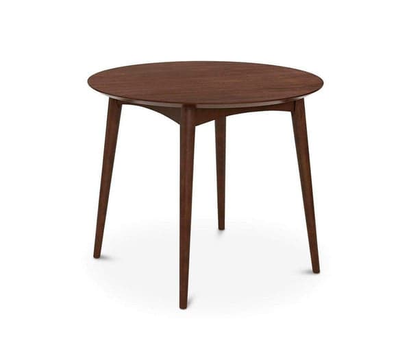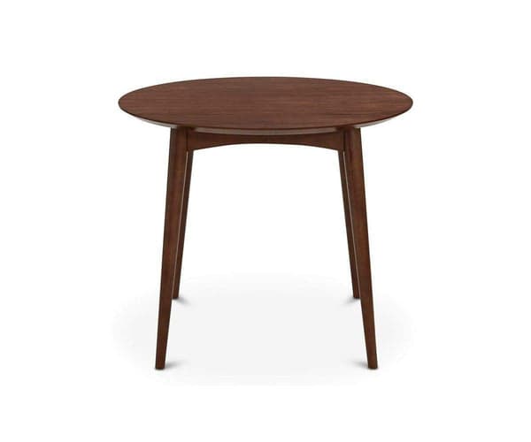 The Juneau Round Table is the embodiment of classic Scandinavian design made to enhance your dining area with polish and grace. Transcending design trends, it features a round tabletop with reverse-beveled edges elevated by elegantly angled and tapered legs in a deep, warm finish. Comfortably seating four, you will be poised for a pleasant dining experience.