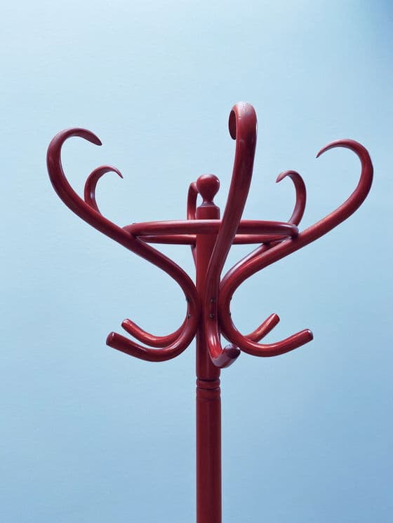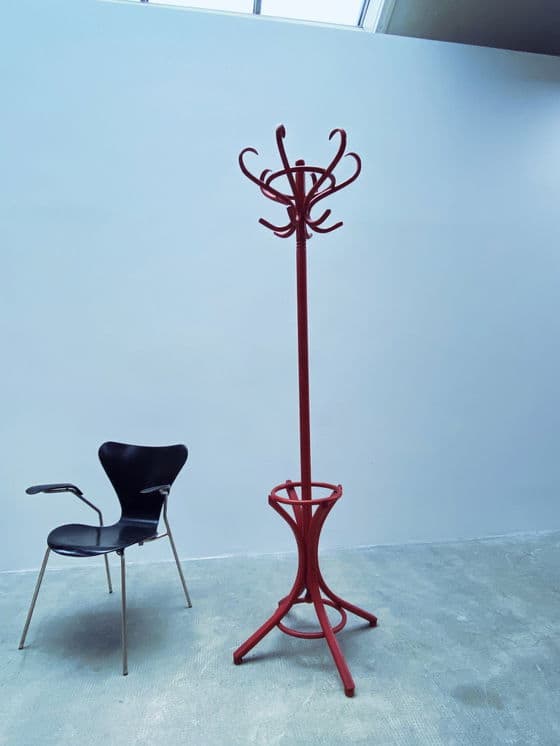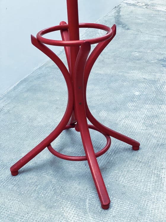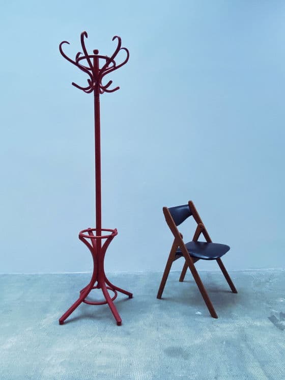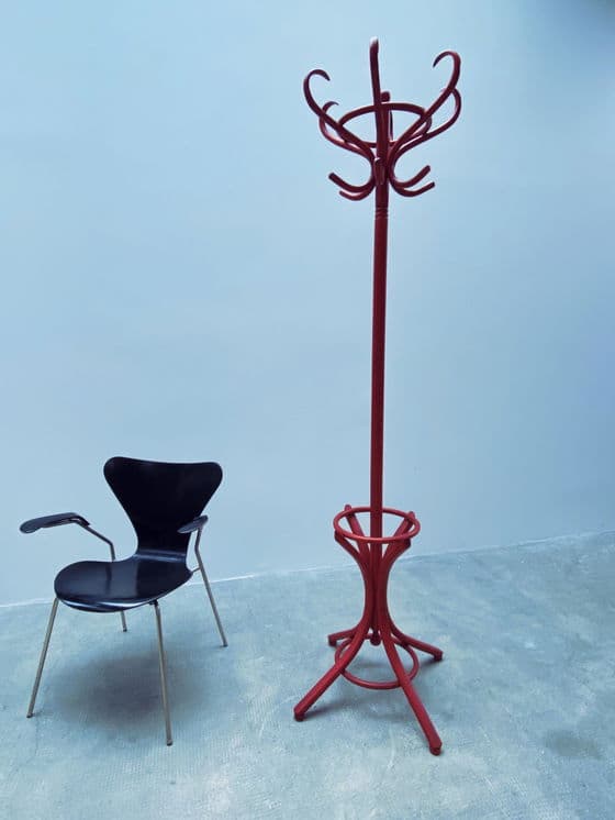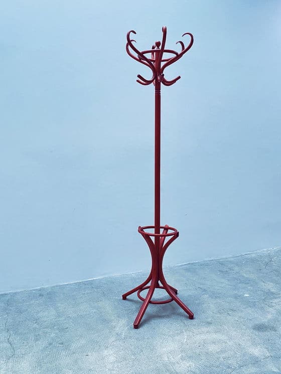 Mooie, oude kapstok van gebogen hout in Thonet-stijl in rood uit de jaren 1980. Jaar: 1980 Materiaal: hout Hoogte: 196cm Diameter voet: 62cm Omdat we handelen in vintage meubels, zijn gebruikssporen onvermijdelijk en onderdeel van de aard van alledaagse voorwerpen. We wijzen daarom alleen op grote gebreken en beschadigingen met aparte foto's. Desondanks doen we altijd ons best om de staat van de items zo goed mogelijk vast te leggen.