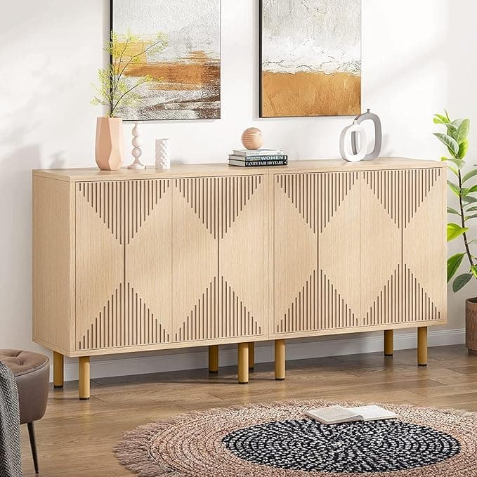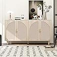 Ample Storage Space: With 59.06W * 13.77D * 31.49H inches, a spacious tabletop, and adjustable shelves, this sideboard provides generous storage space for kitchen essentials. The versatile design allows for customized arrangement. Door with Rebound Mechanic: Pressing the upper door's surface activates the rebound mechanism, allowing for smooth, easy opening. The handleless design is perfect for multitasking, making it easy to open with a foot or knee. More Stable with Anti-toppling Device: Equipped with five thick metal legs, this sideboard can safely hold up to 200lbs. It also features an anti-toppling device, ensuring the safety of children. Both Practical and Stylish: Made from high-quality, water-resistant manufactured wood, this sideboard is easy to clean and has a modern white finish. The intricately carved doors add a unique touch to the design, making it a stylish addition to any home decor. Easy to Assemble: With a simple structure, detailed instructions, and labeled parts, this cupboard is easy to assemble. Our customer service team is always available to assist with any issues you may encounter.