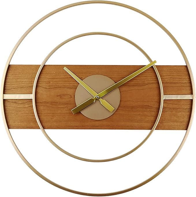 Large Decorative Clock in The Living Room, Round Metal Iron, Walnut Gold Wood Wall Clock, Minimalist, Battery Operated, Silent and No Ticking, Suitable for Kitchen, Bedroom, Study, Office, 27”