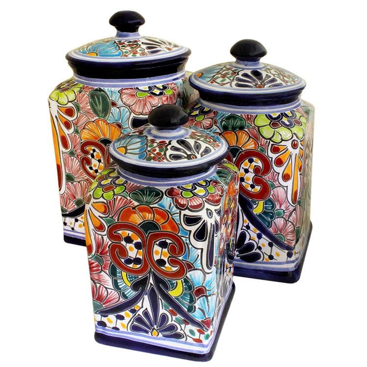 These delightful Talavera Kitchen Canisters embody all the charm of Mexican Talavera. Featuring classically-styled floral patterns and multi-colored designs, these striking Talavera Kitchen Canisters will complement any home decor! Be sure to purchase enough canisters for all your kitchen storage needs. Handmade in Mexico and available in three sizes, below. ORDER THE SET OF THREE AND SAVE 10 PERCENT!