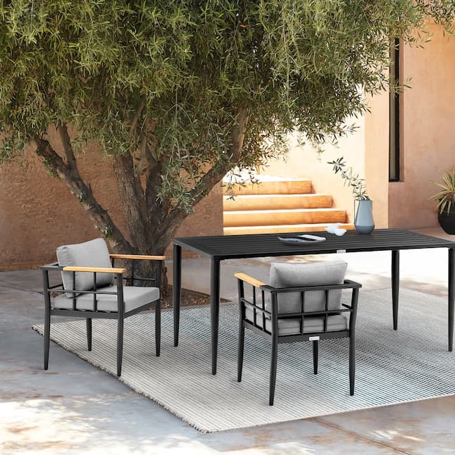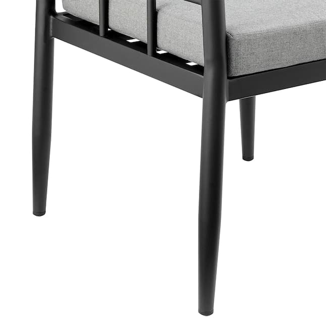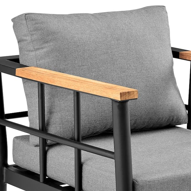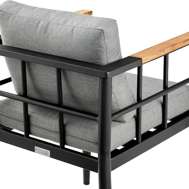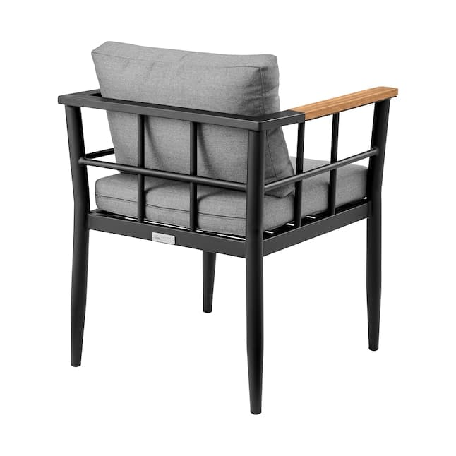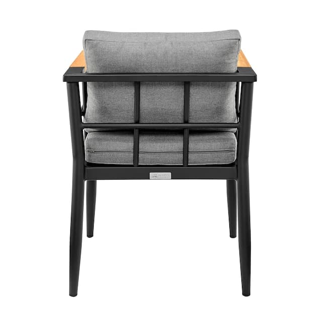 Add a touch of modern beauty to your indoor or outdoor space with the Ezra Patio Aluminum and Teak Dining Chairs – Set of 2 from Armen Living. Featuring a geometric barrel style design that provides ergonomic properties to keep your back properly aligned, the Ezra is a true work of art and is the ideal piece of outdoor patio furniture. The teak accents on the arms give the outdoor chairs with cushions a warm touch, strong and durable, teak can last for generations in a wide variety of climates with zero maintenance. This is due to the high rubber and oil content of the wood that leave it impervious to rain, weather, and pests, making it virtually immune to rot. These patio dining chairs includes plush dark gray high density foam cushions to offer a wonderfully comfortable sitting experience.