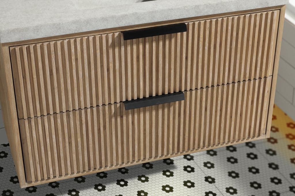 Transform your bathroom with the 36 inch San Diego single sink vanity, which will serve as the focal point of your remodel. The vanity is expertly crafted from solid wood to ensure durability for years to come. The wood is finished with raised grain to create a distressed and reclaimed appearance. The two solid wood dovetail drawers feature full extension glides, providing ample storage space for your daily toiletries. The mid century modern style is completed with a sturdy concrete countertop that complements the design of the vanity.